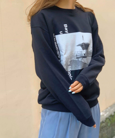 雰囲気ある転写プリントの“baystreetクルーネックスウェット”