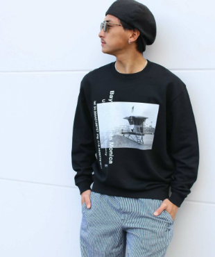 雰囲気ある転写プリントの“baystreetクルーネックスウェット”