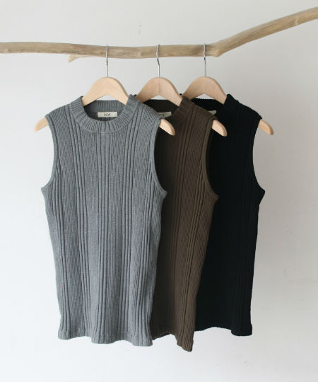 女性らしい着こなしが叶うランダムリブニットモックネックタンク。