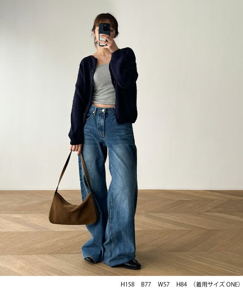 首元はクルーネックでカジュアルな印象のニットカーディガン。