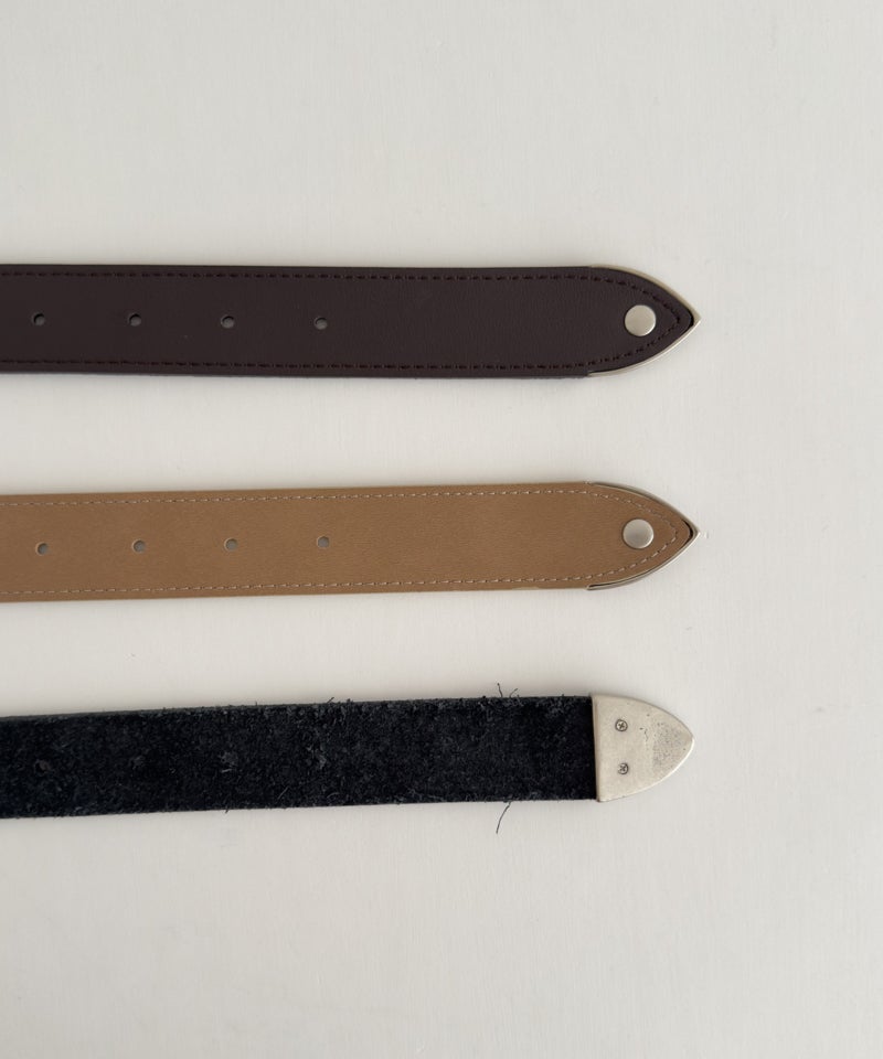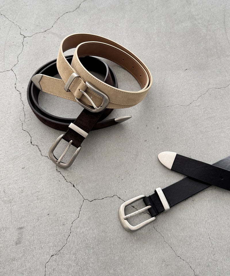 丸みのあるバックルと剣先のメタルパーツがさりげないアクセントになり、スタイリングを引き締めてくれます。