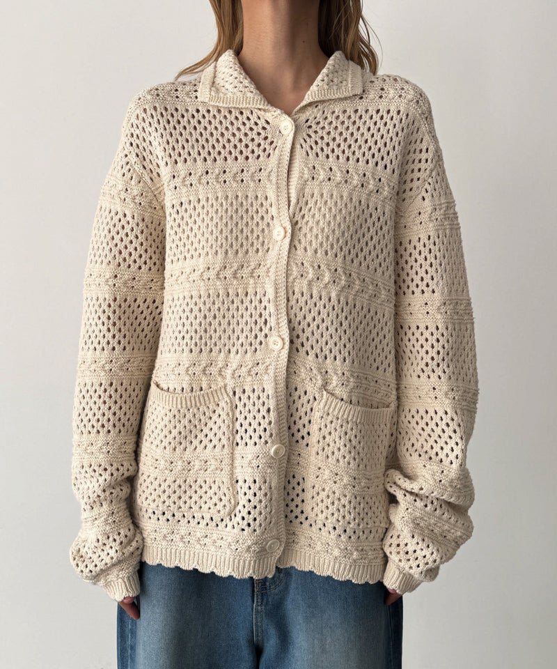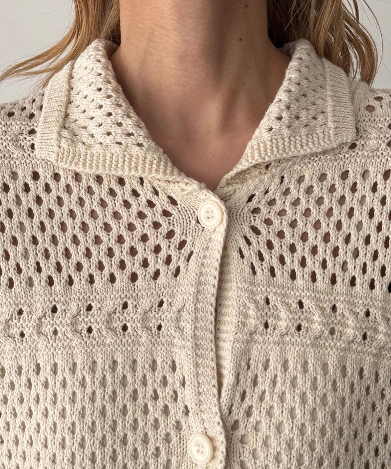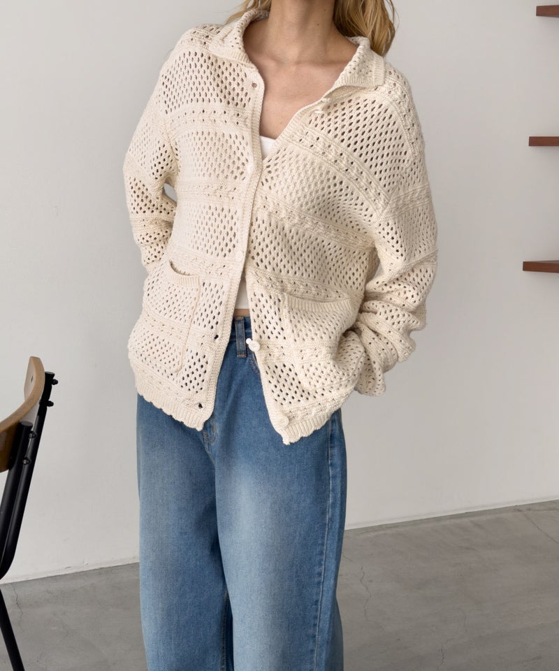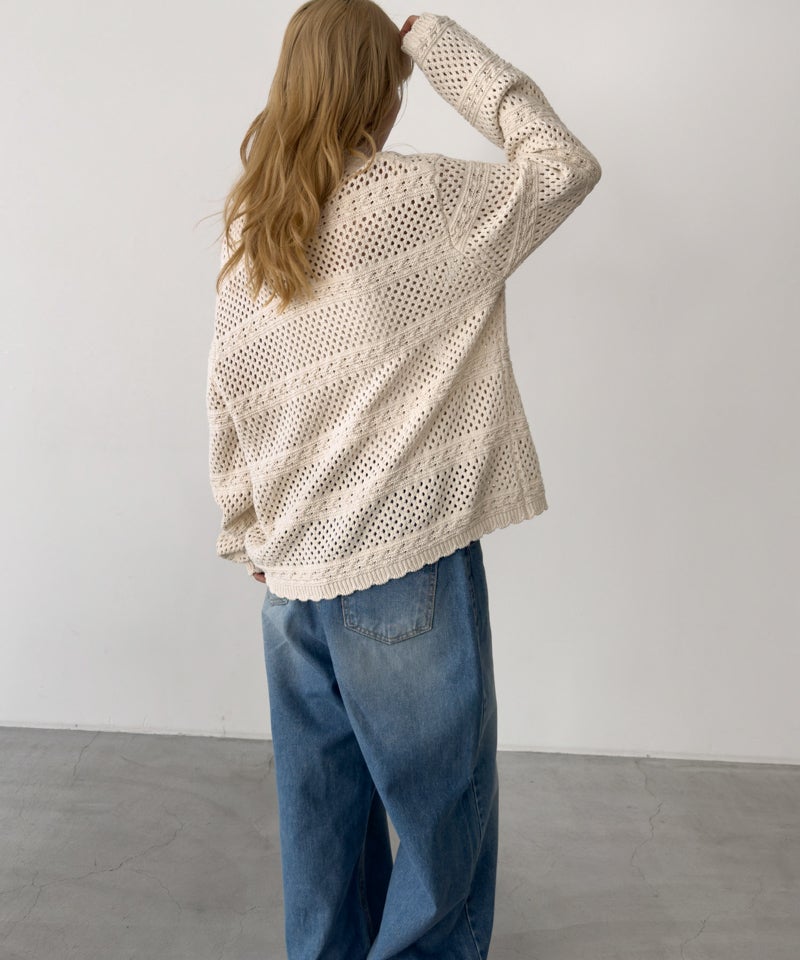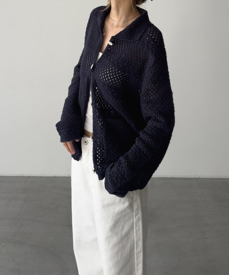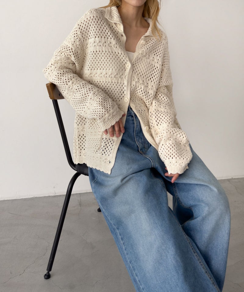 透かし編みならではの軽やかさがあり、1枚羽織るだけでスタイリングに奥行きをプラス。
