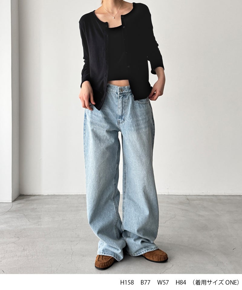 デニムやワイドパンツを合わせて、ラフに着こなすのがおすすめ。