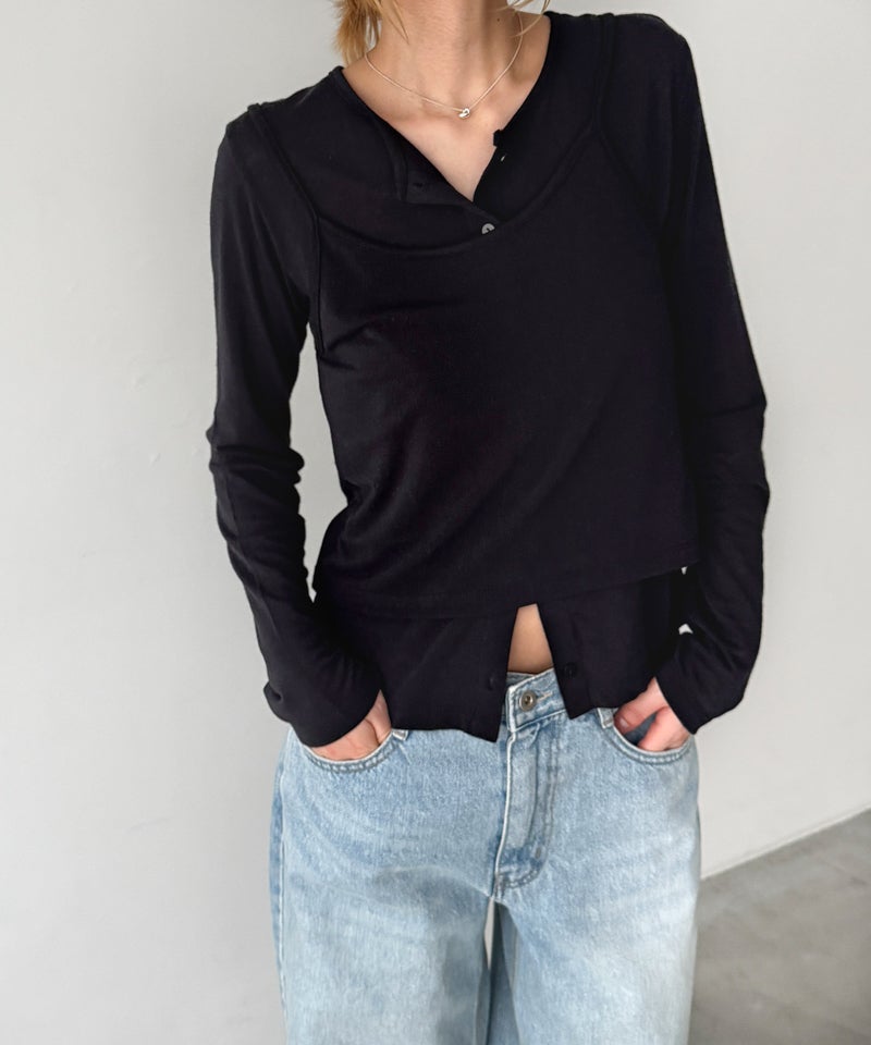 レイヤード風のデザインがさりげないアクセントになり、シンプルなボトムともバランス良くまとまります。