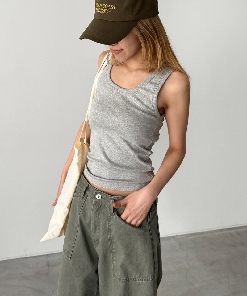 深めに開いたラウンドネックが、デコルテを綺麗に見せてくれるタンクトップ。