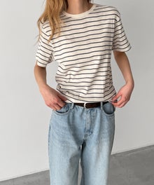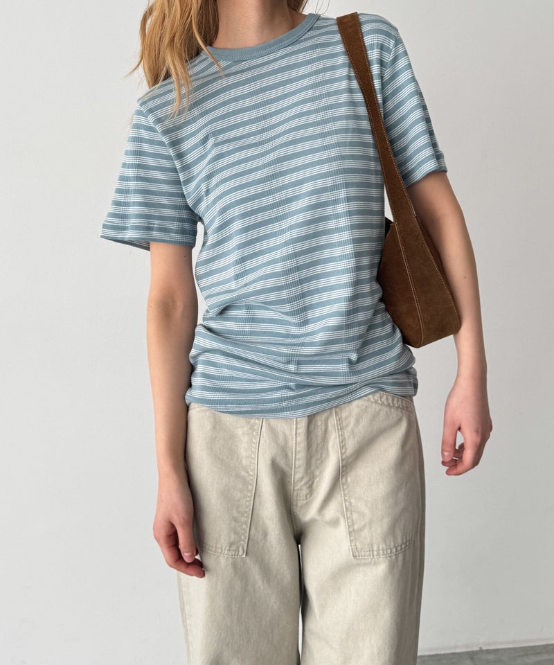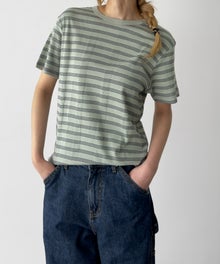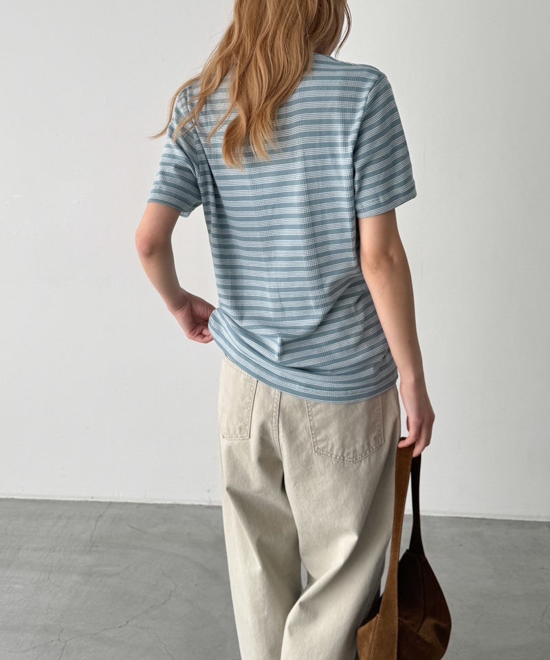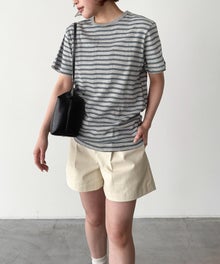 首のつまったデザインでシンプルなシルエットの半袖Tシャツ。