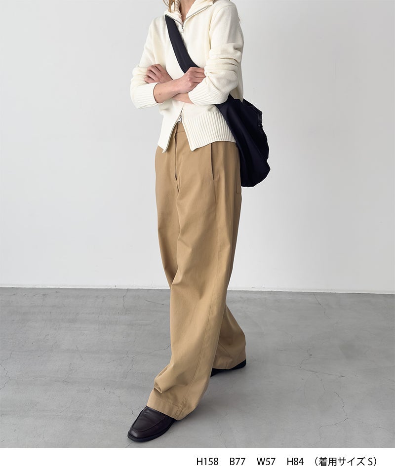程よくワイドなストレートシルエットで脚のラインを拾いにくく、スッキリとした印象に仕上げてくれます。