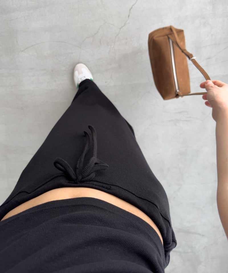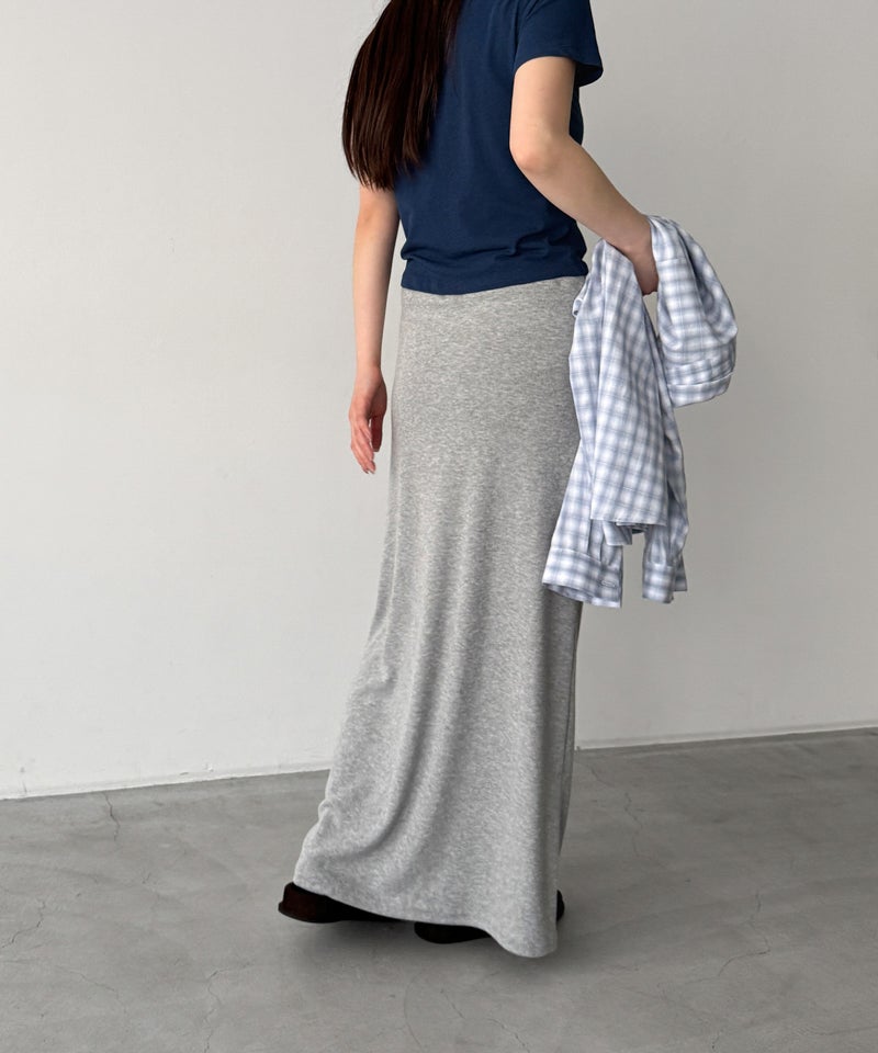 縦のラインを強調するリブ編みと、ストンと落ちるストレートシルエットがすっきりとした印象を与えるロングスカート。