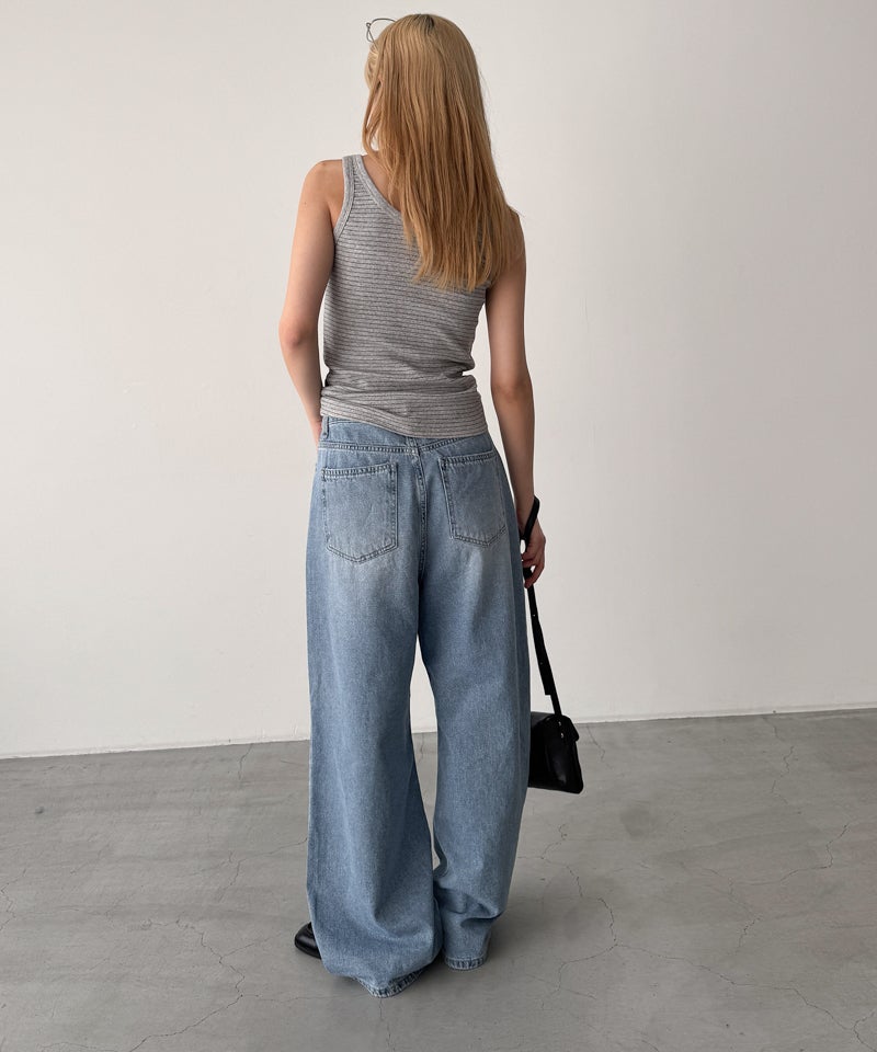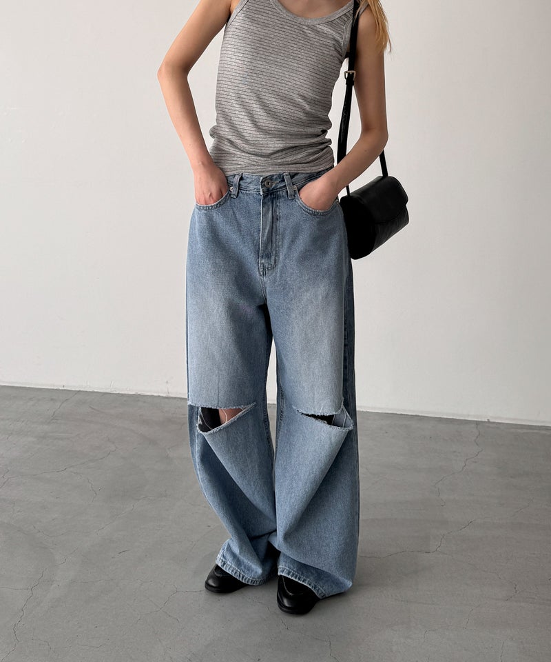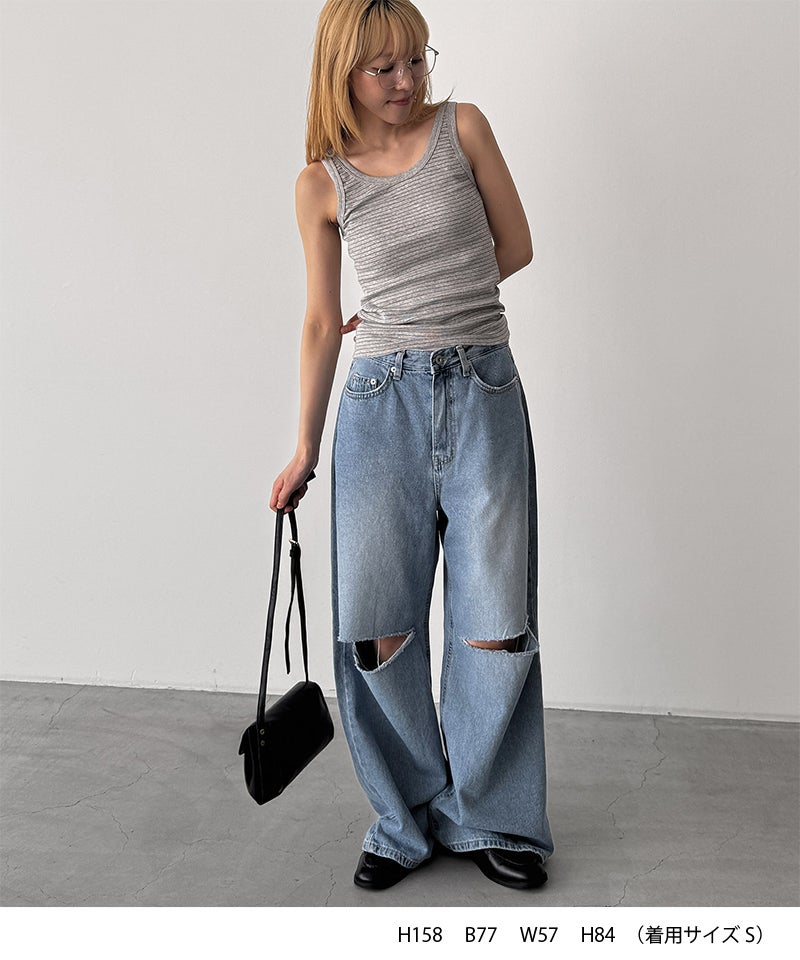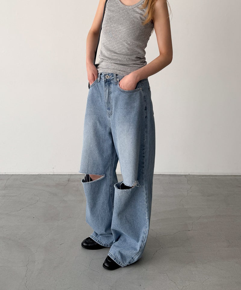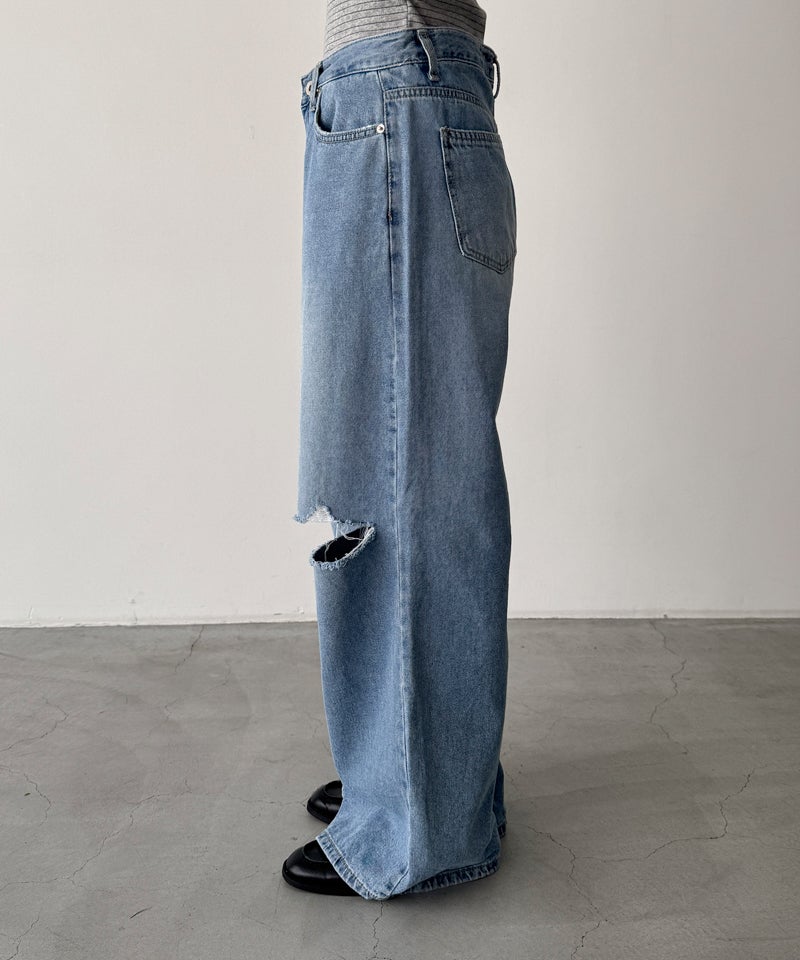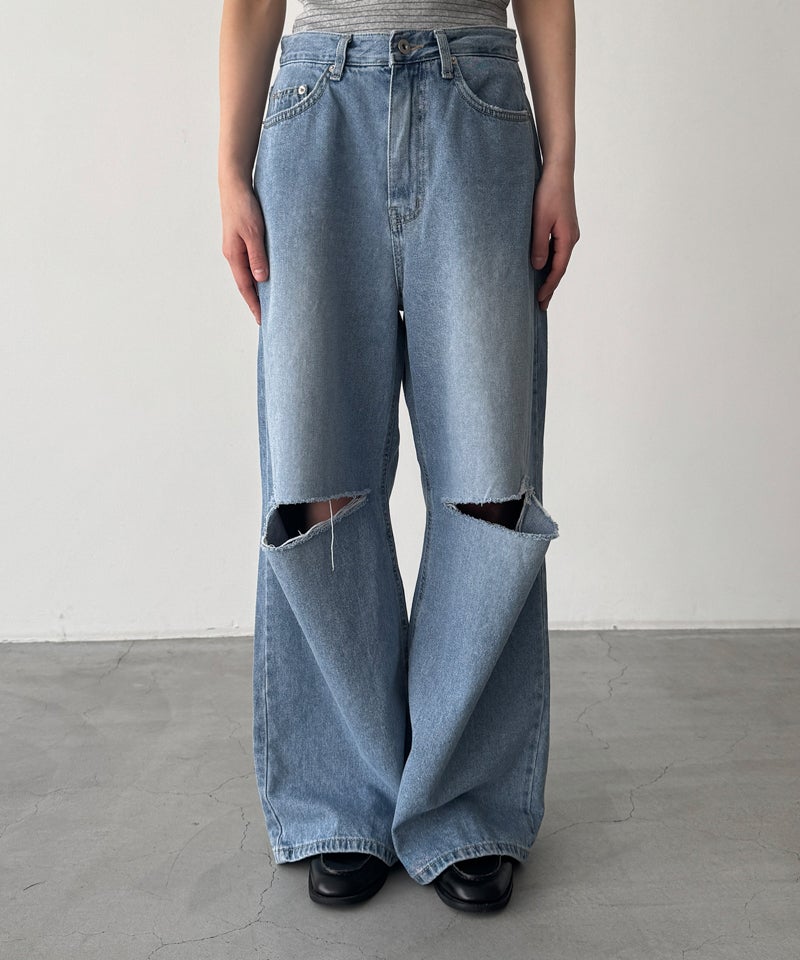 両膝に施されたスリット状のダメージ加工が、スタイリングに程よい抜け感をプラスするデニムパンツ。