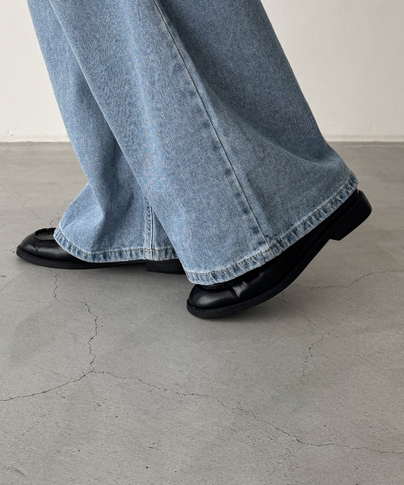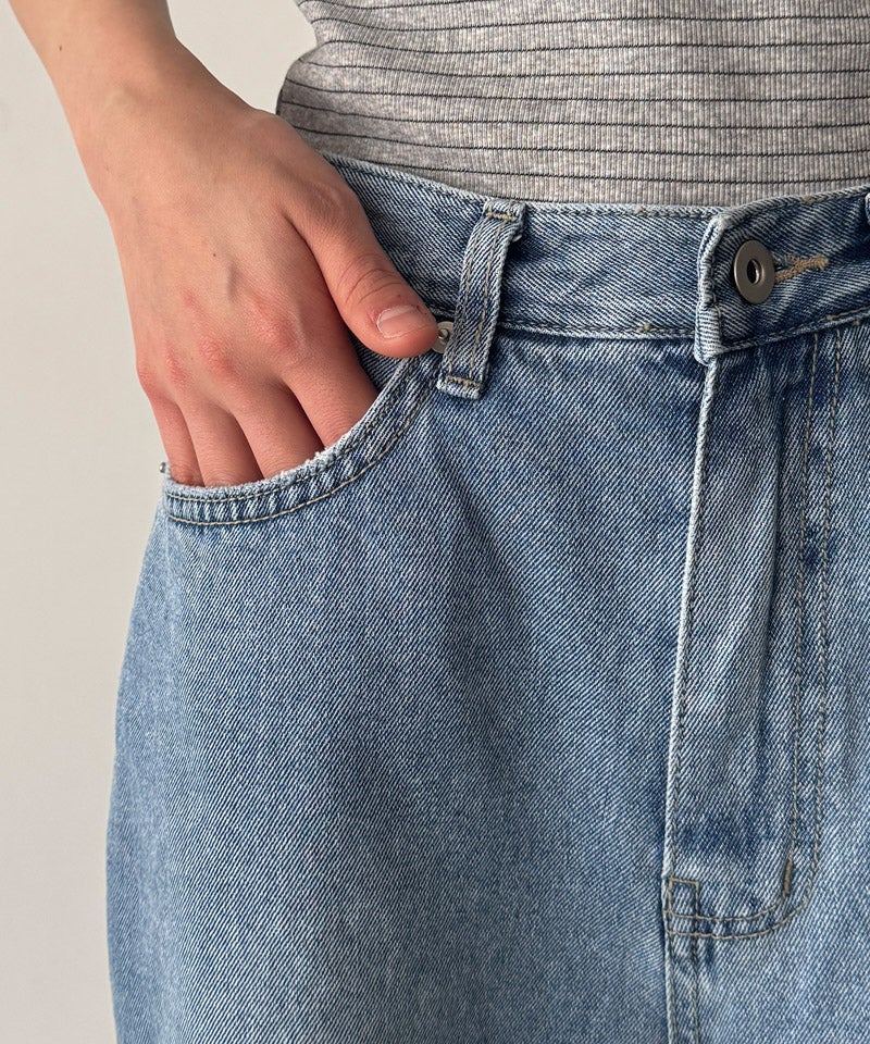 太ももから裾に向かってストンと落ちるワイドストレートシルエットで、脚のラインを拾わずスタイルアップ効果も抜群です。