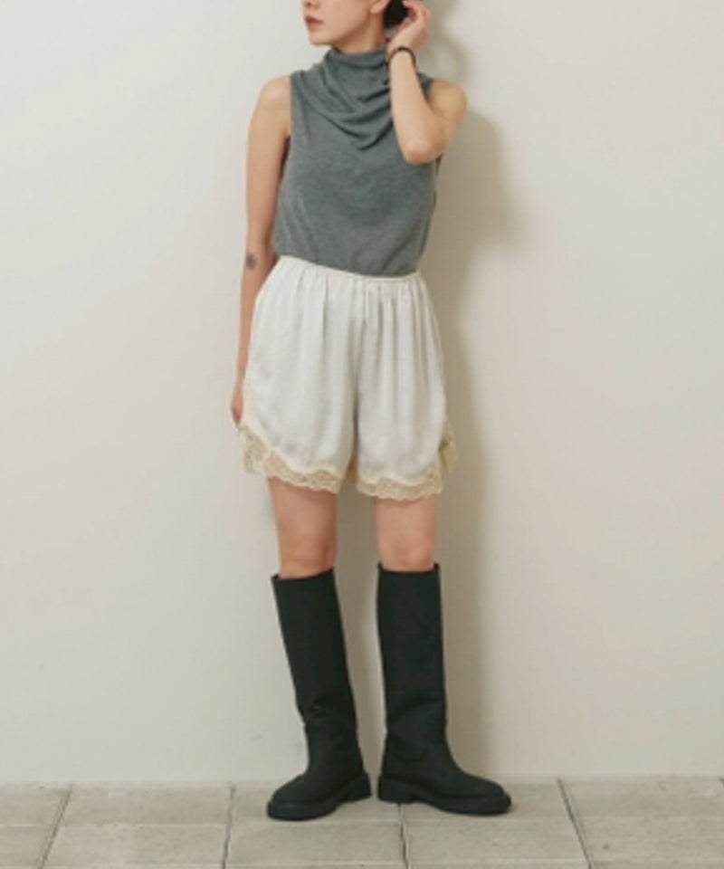 繊細なレースゴムを用いたウエストデザインや高級感のあるレースが、ミニマルな中に品のある華やかさを添える一枚です。