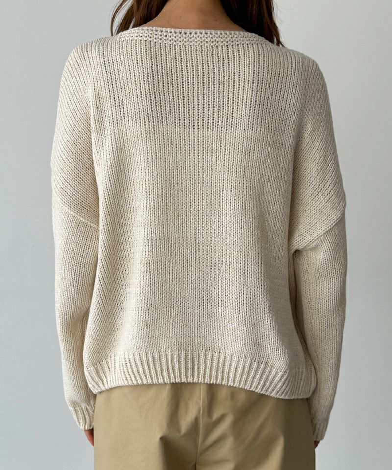 首元はクルーネックでカジュアルな印象のニットカーディガン。