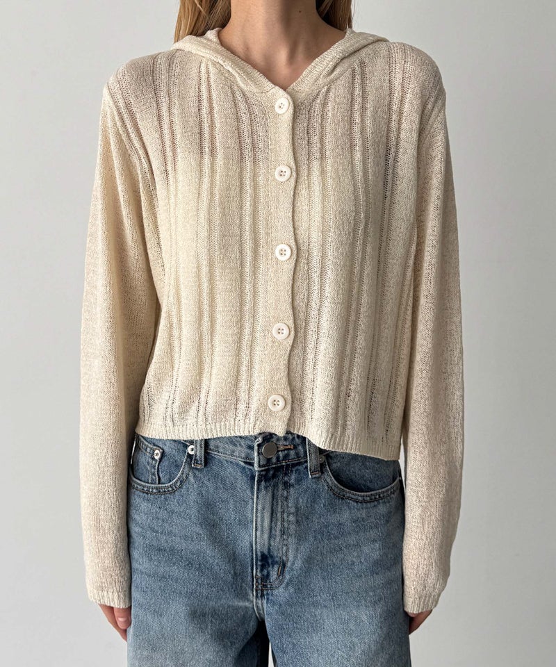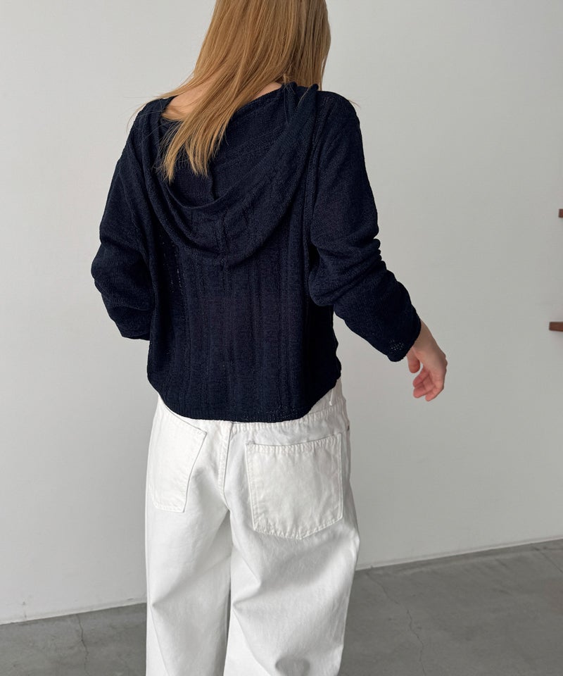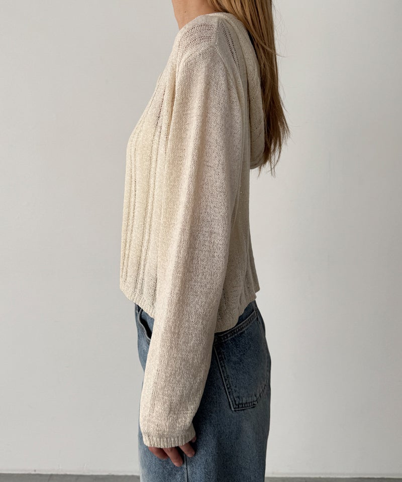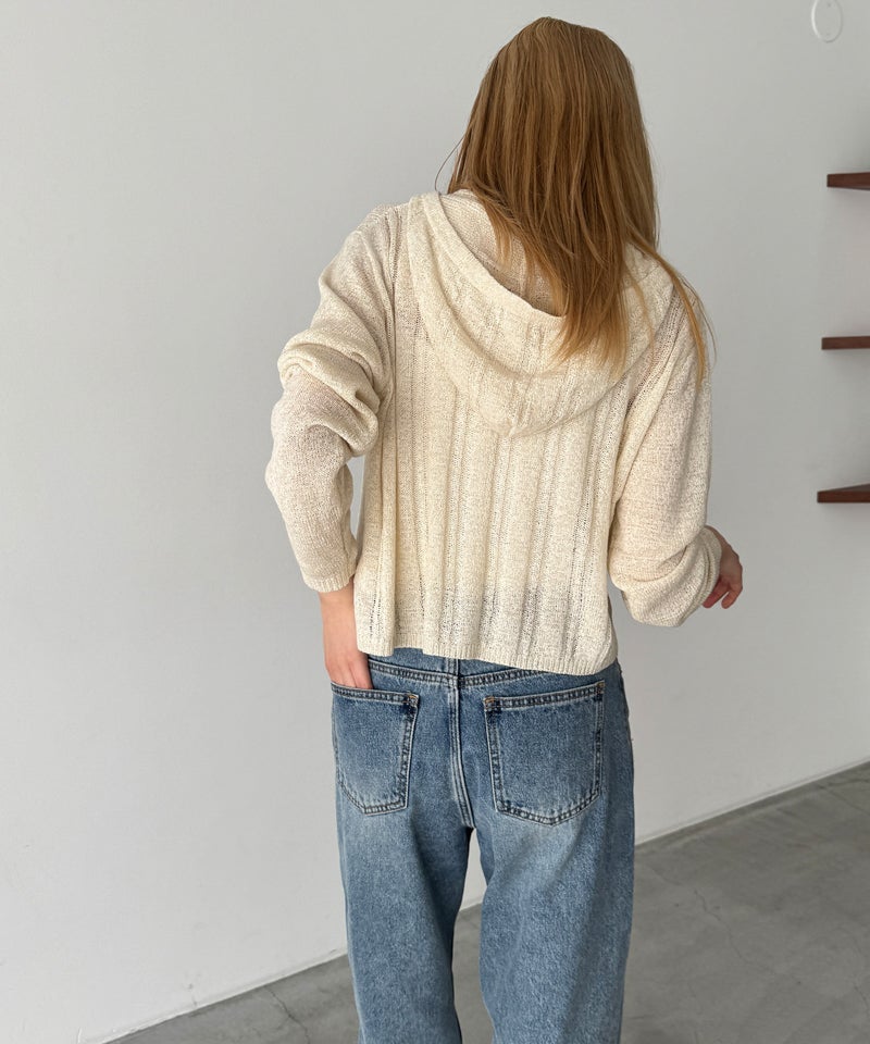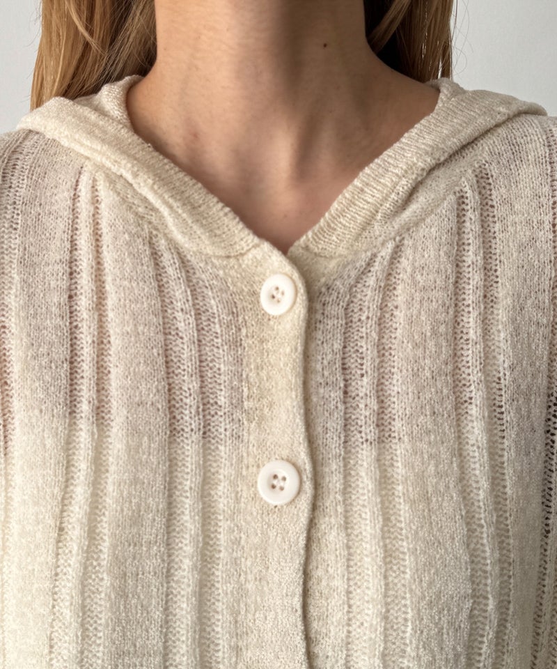 カジュアルなフードデザインと、抜け感のあるシアー素材を掛け合わせたニットカーディガン。