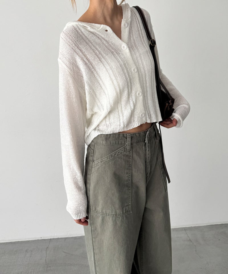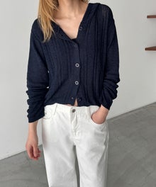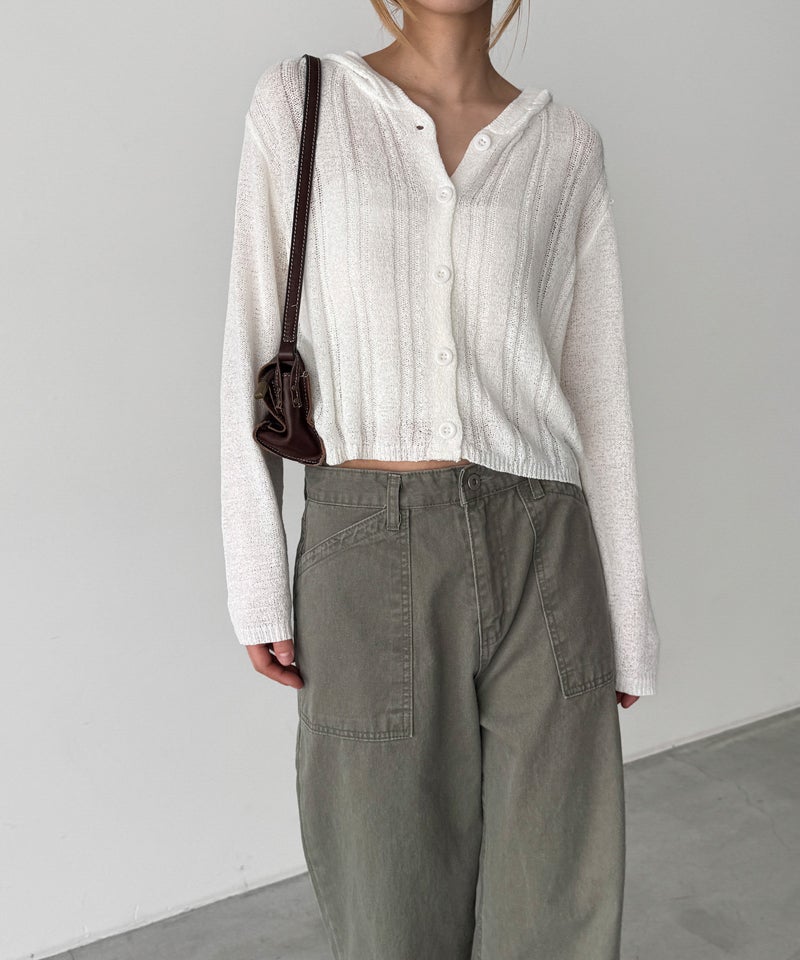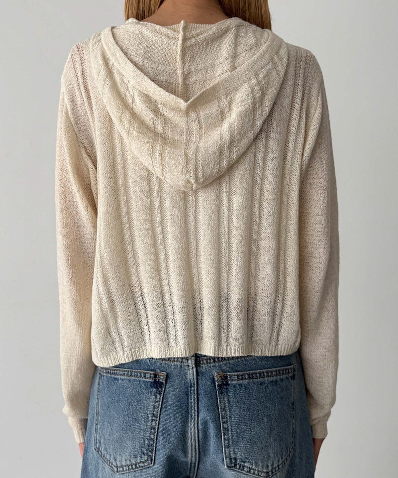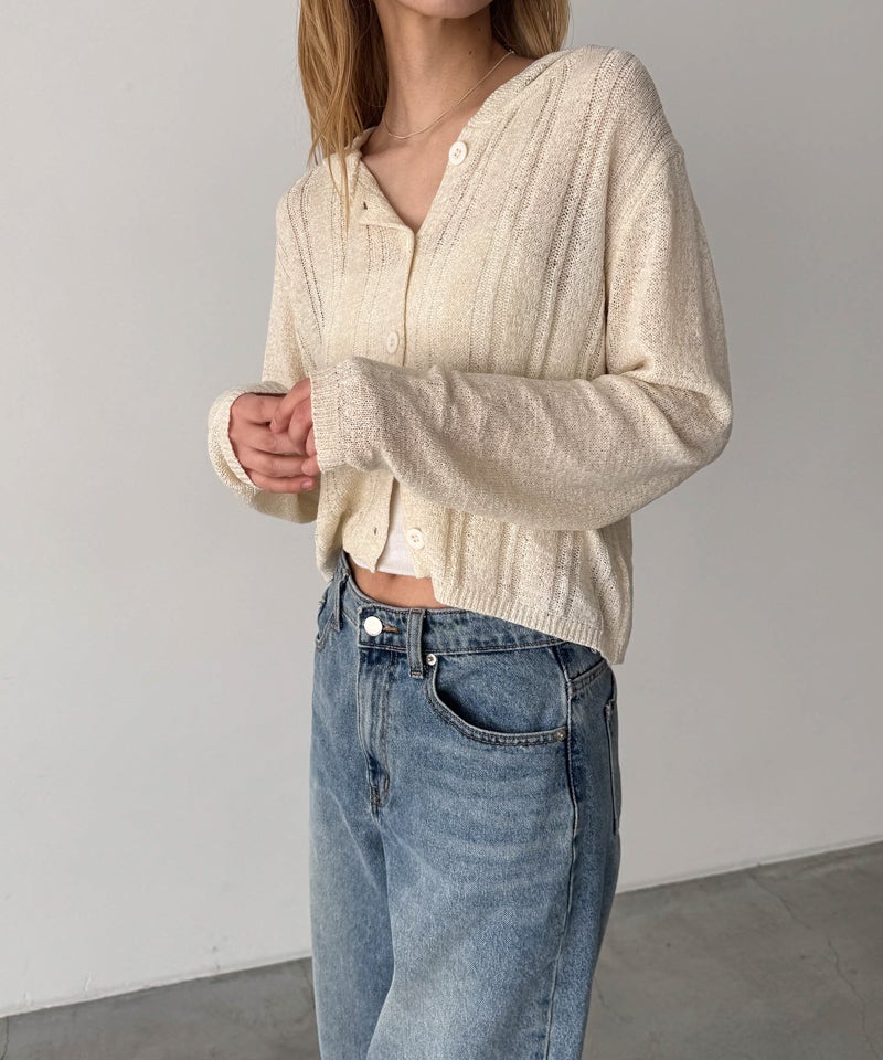 カジュアルなフードデザインと、抜け感のあるシアー素材を掛け合わせたニットカーディガン。