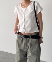 前を全て閉じてプルオーバーとして着用すれば、レースの柄がより際立ち洗練された印象に。
