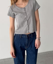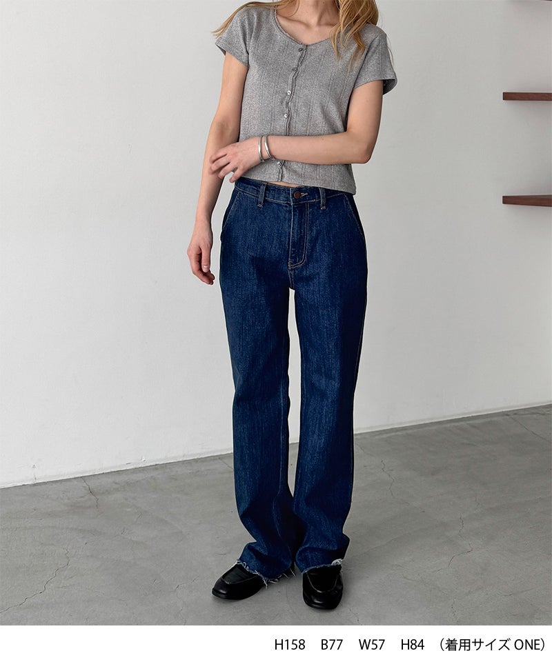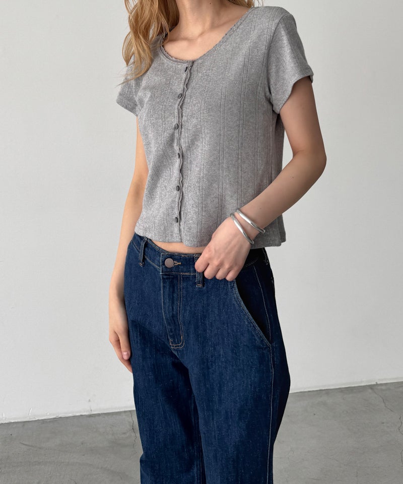 デコルテを綺麗に見せる絶妙なネックラインと、フロントに並んだ小ぶりなボタンが上品な雰囲気を醸し出します。