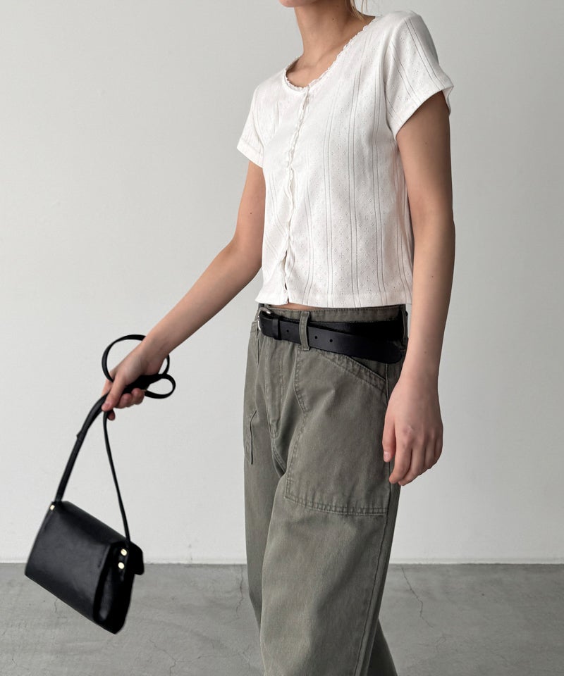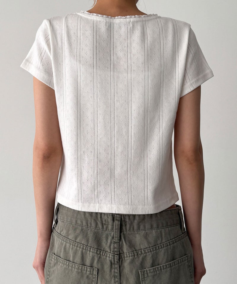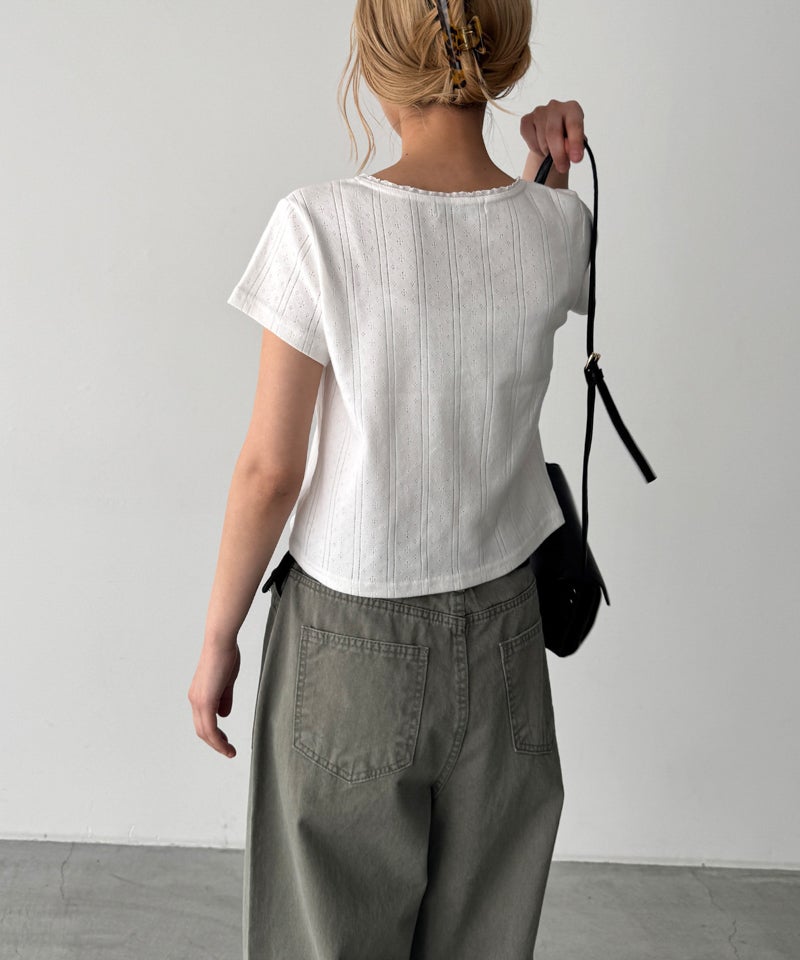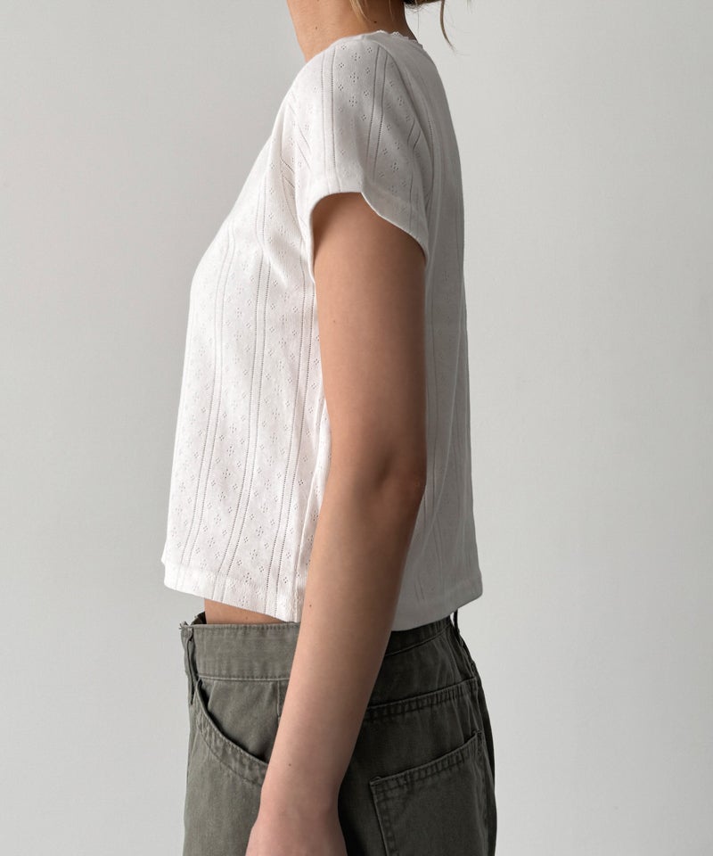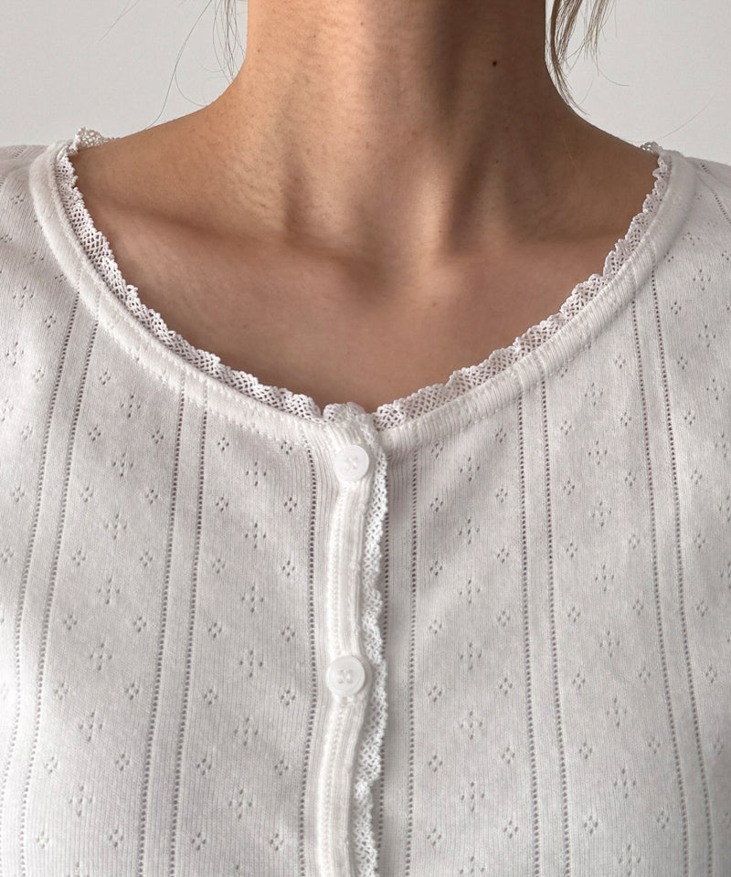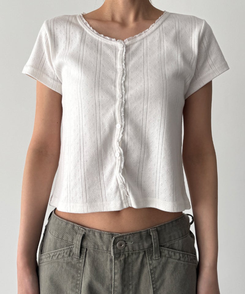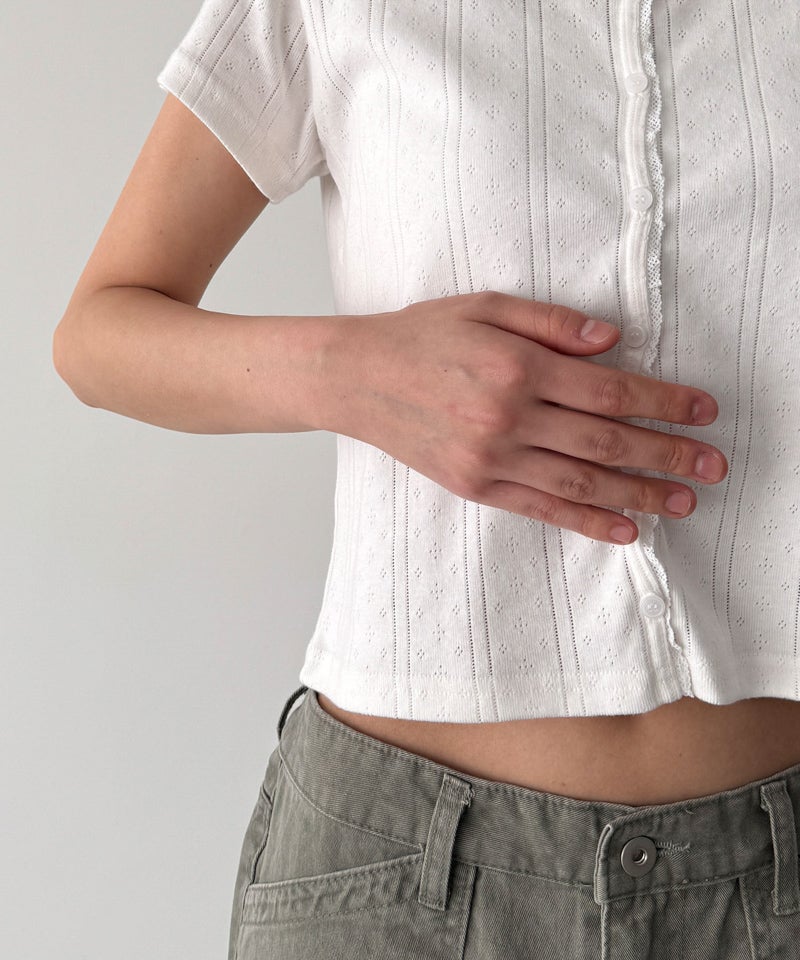 繊細なアイレットレースの透かし編みが、女性らしく軽やかな印象を与える半袖カーディガン。