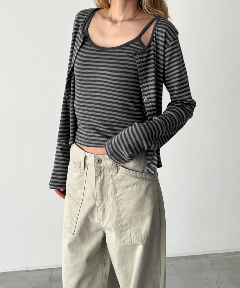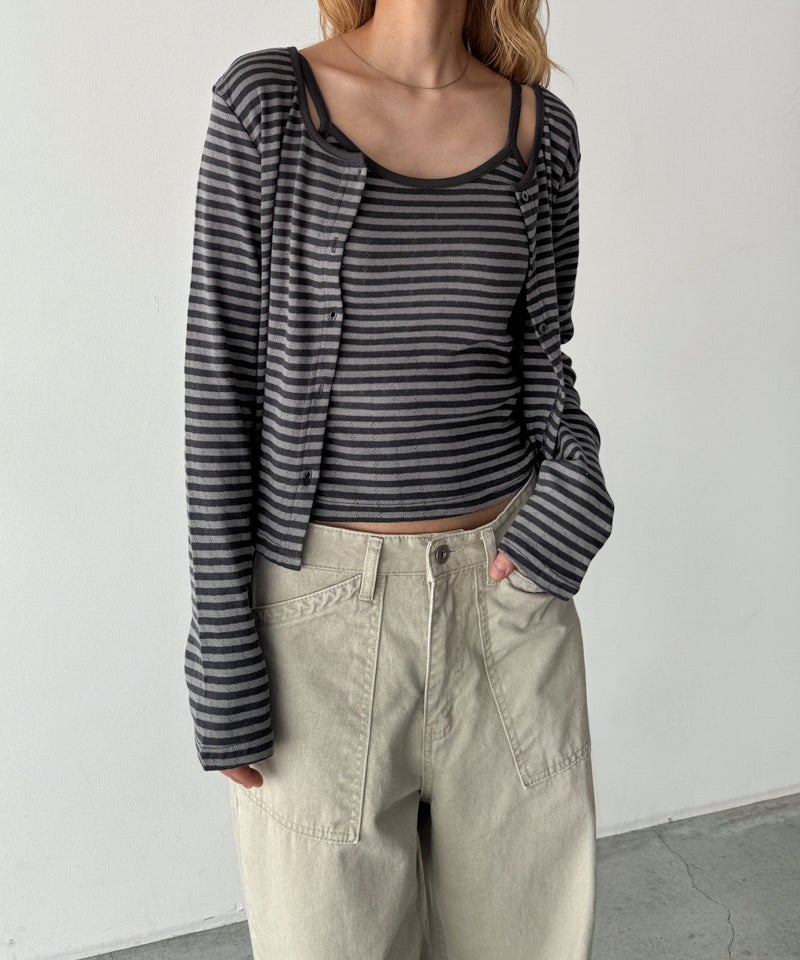 タンクトップとカーディガンのセットで、1枚で着映えするレイヤードスタイルが完成します。