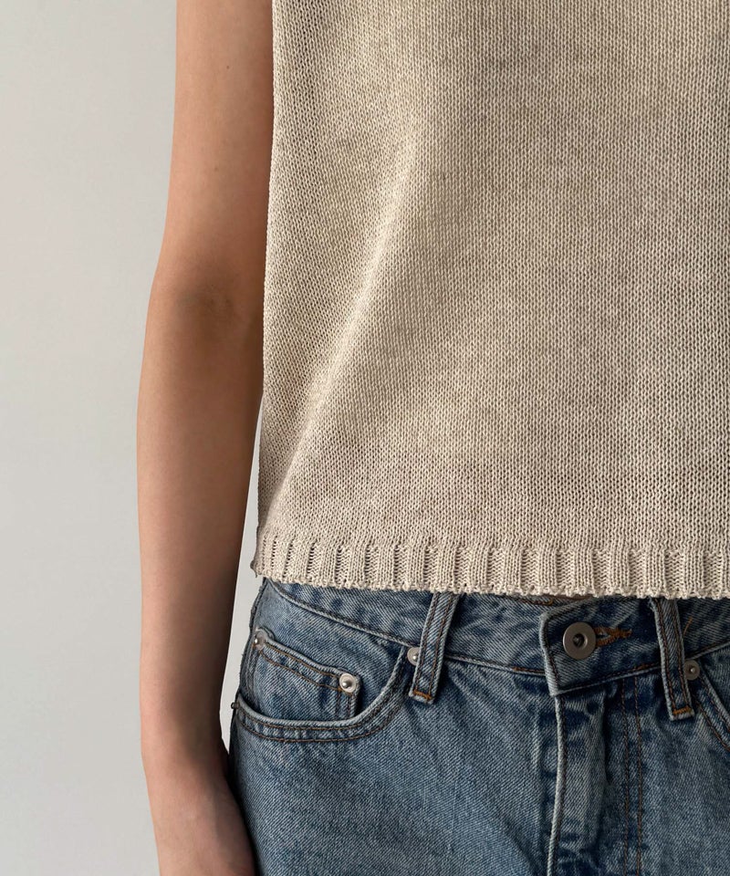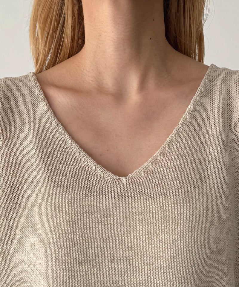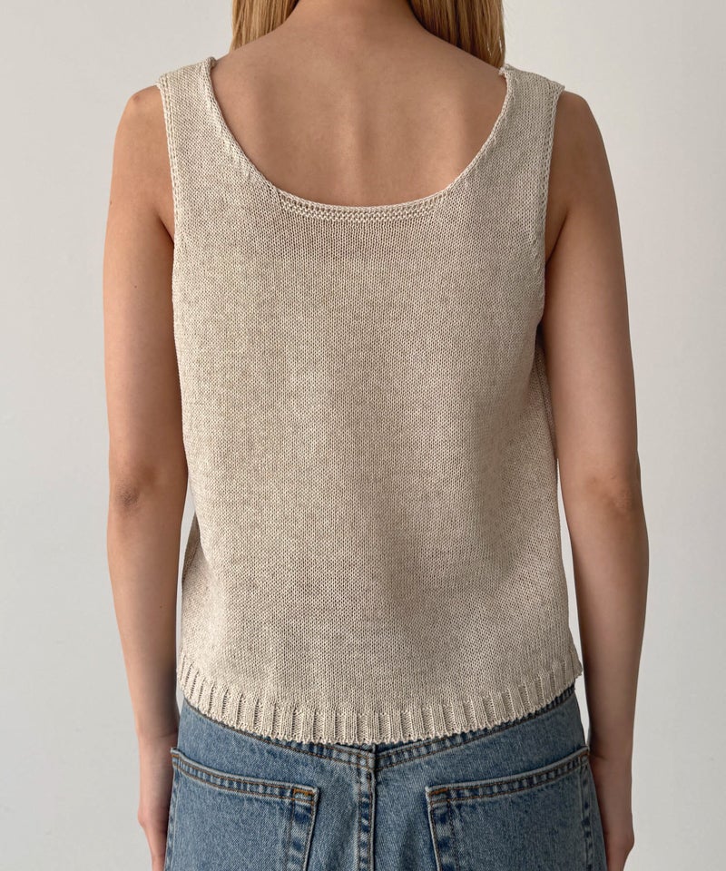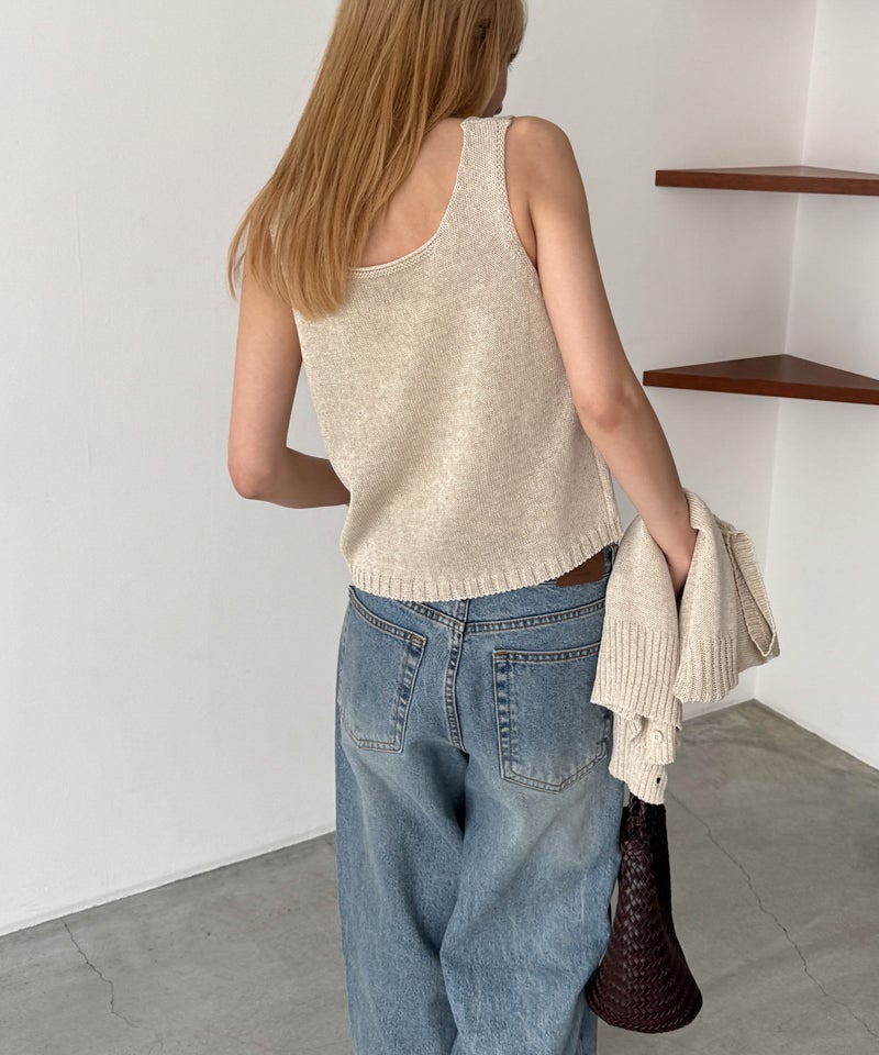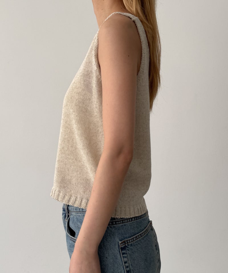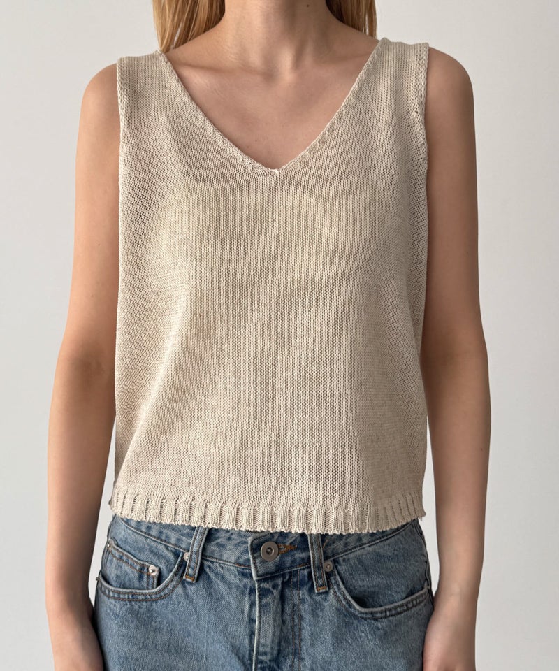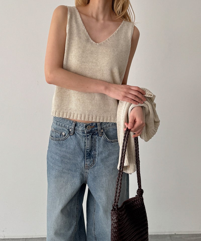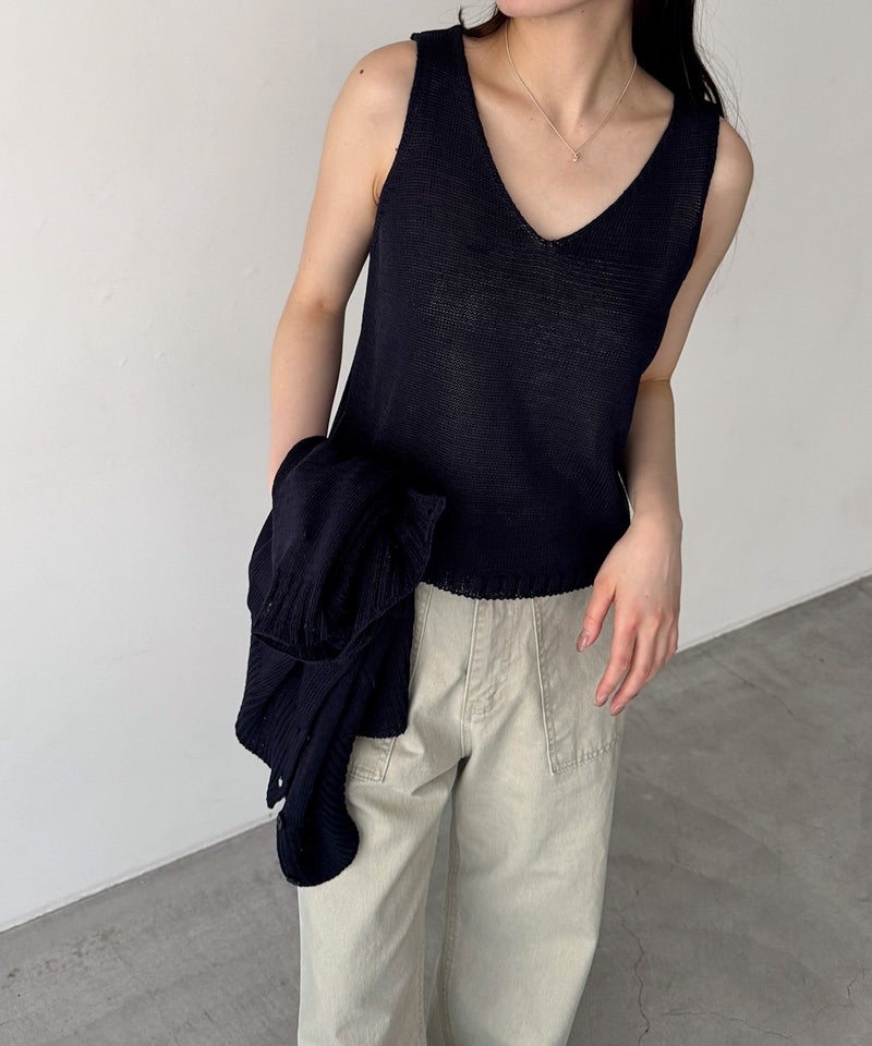 タンクトップはデコルテを美しく見せる程よい開きのVネックで、女性らしい抜け感を演出します。