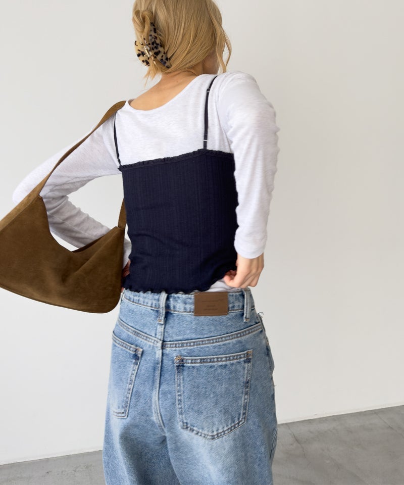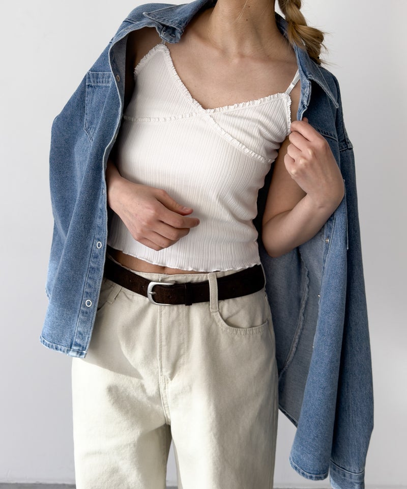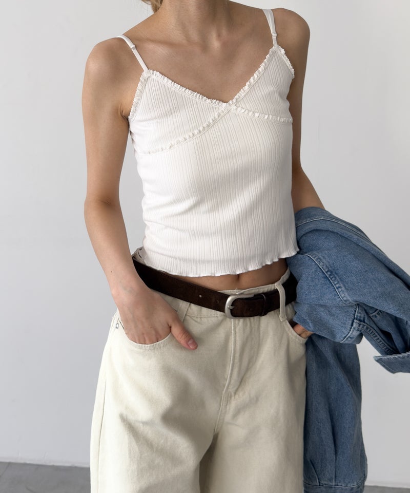 華奢なストラップとレーストリムが女性らしい印象のキャミソール。
