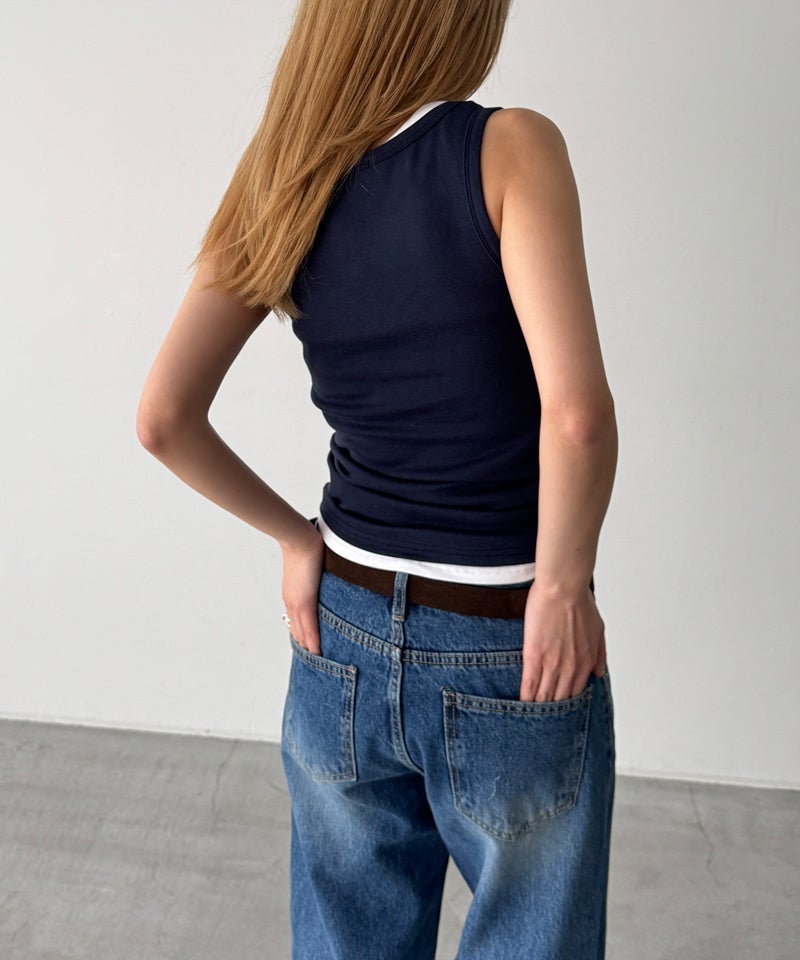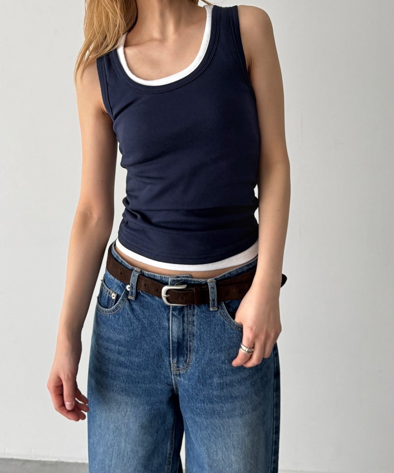 同型のタンクトップを重ねたレイヤードスタイルもおすすめで、インナーをちらりと見せることでシンプルなコーディネートに奥行きが生まれます。