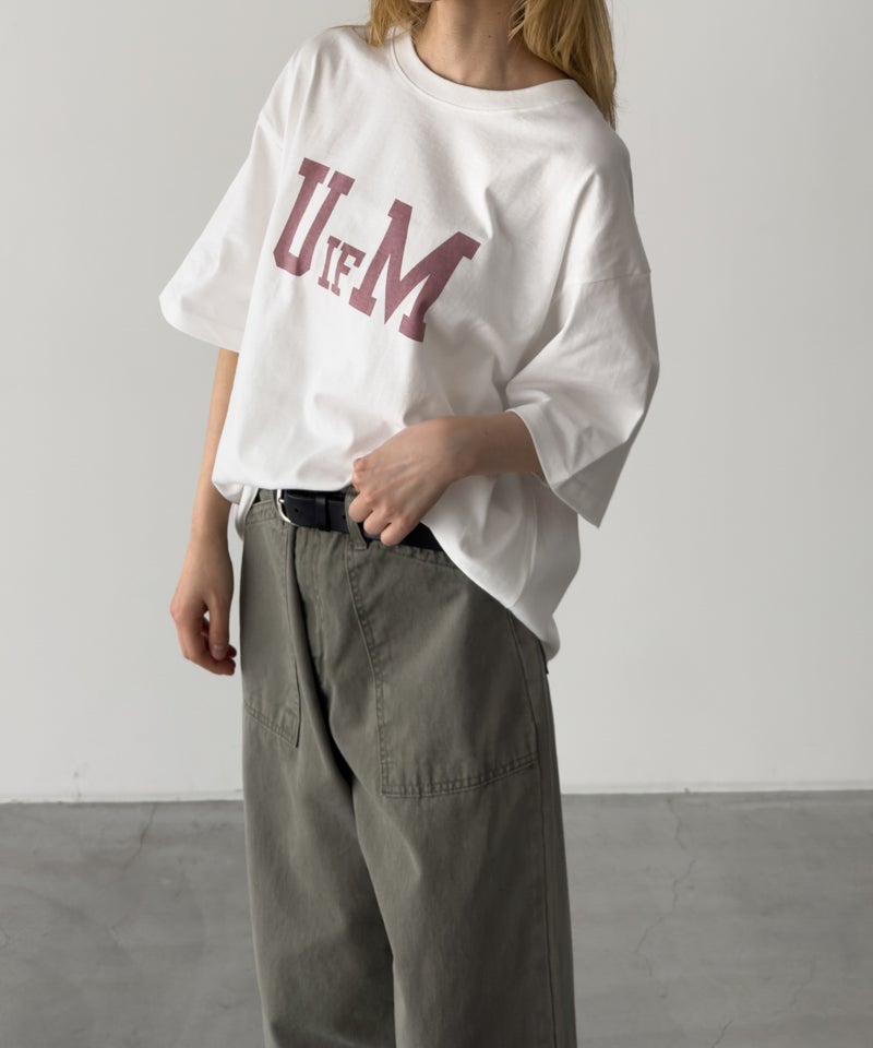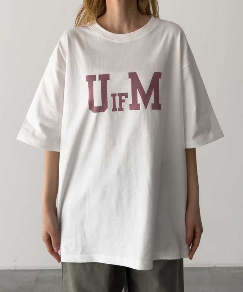 ヴィンテージ感のある、かすれた「U IF M」のロゴプリントが目を惹く半袖Tシャツ。