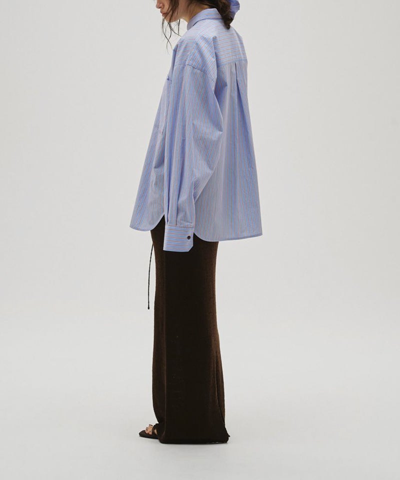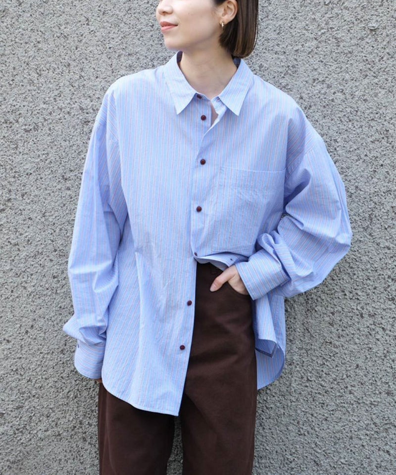カラーごとに異なるストライプピッチが魅力で、胸元のポケットや配色ボタンがさりげないアクセントに。