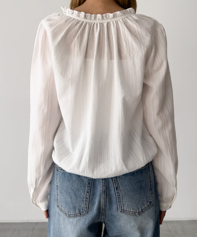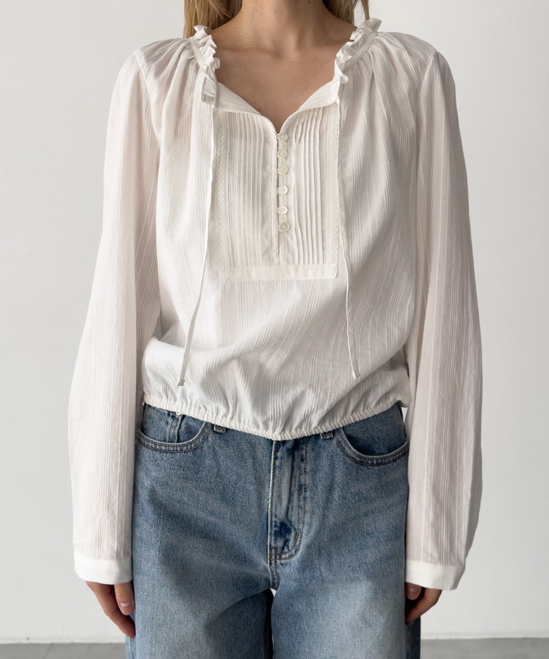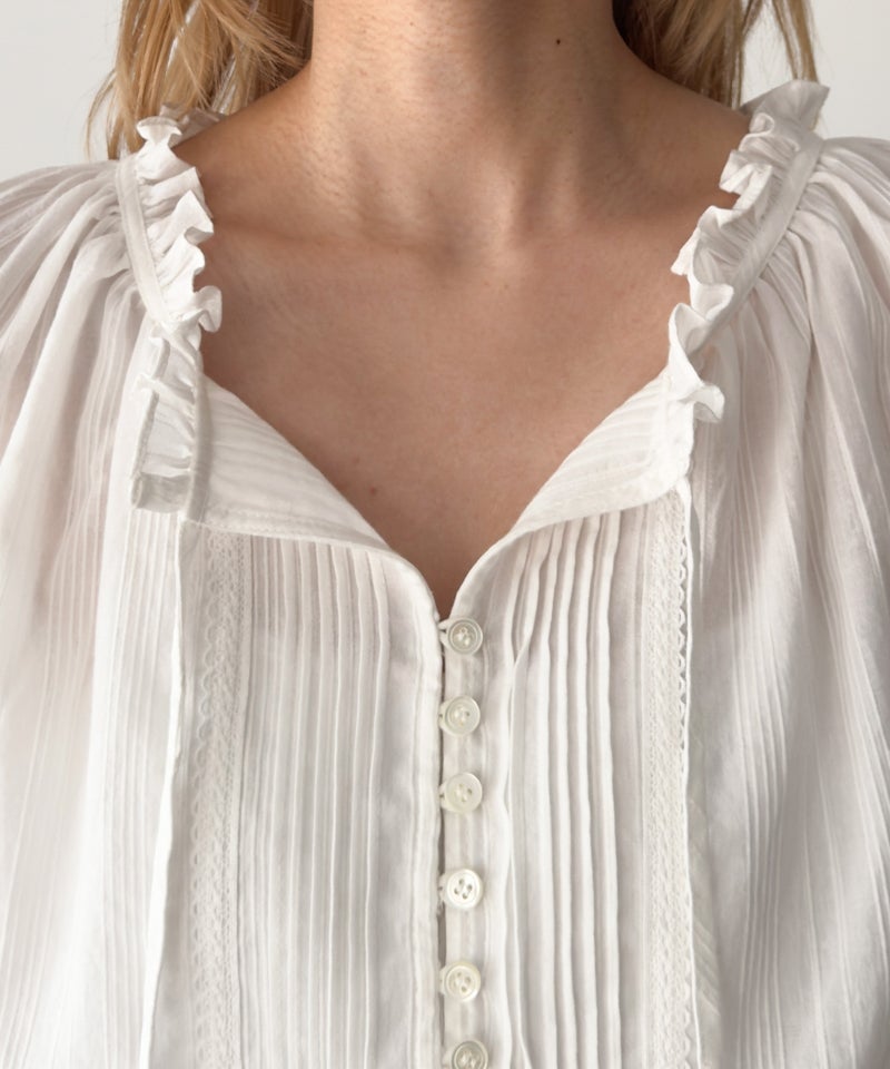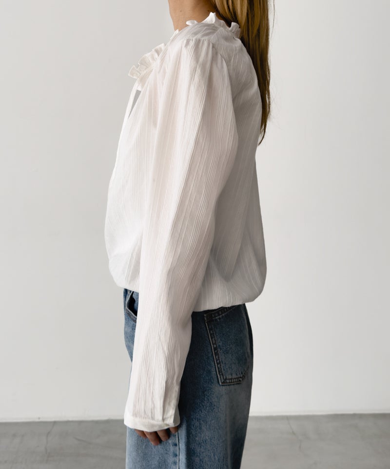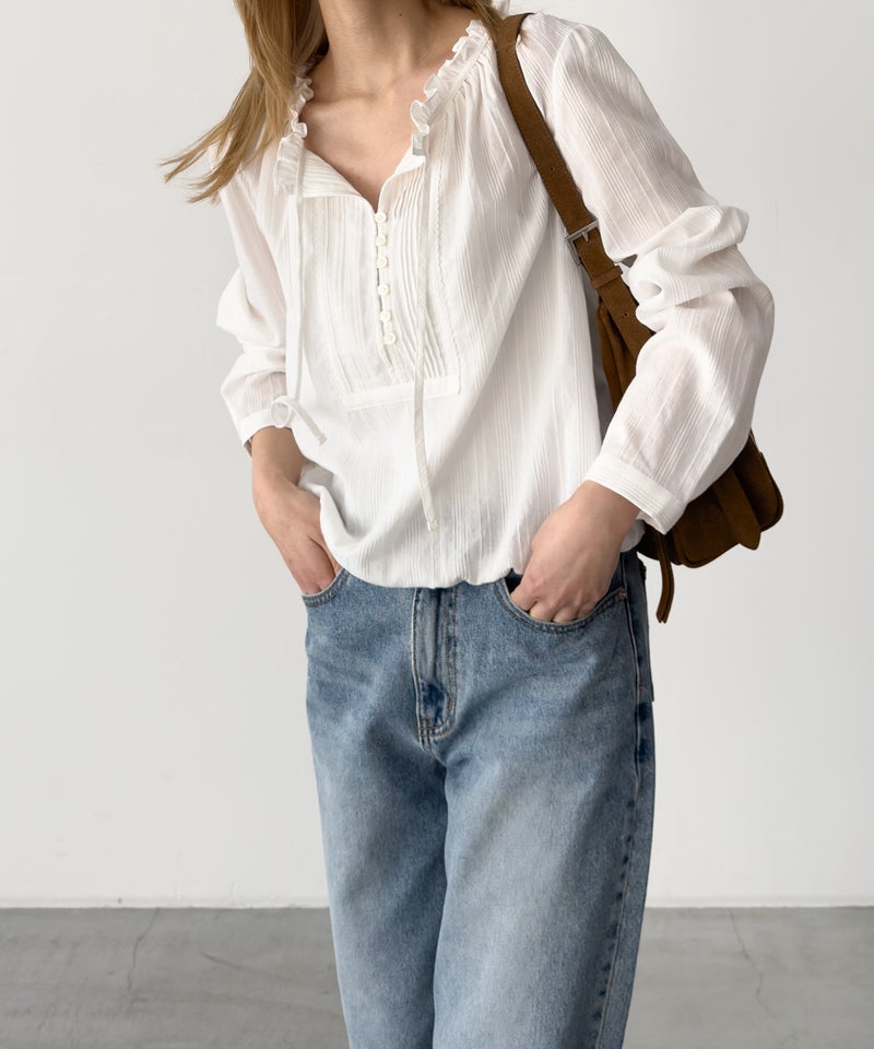 ピンタックデザインと首元のフリルがポイントのブラウス。