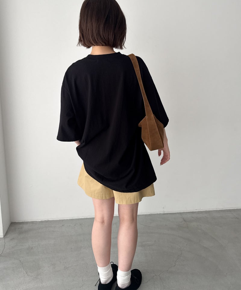 着丈が長めなので、そのままルーズに着こなすのはもちろん、フロントだけ軽くタックインするとすっきりとバランス良くまとまります。
