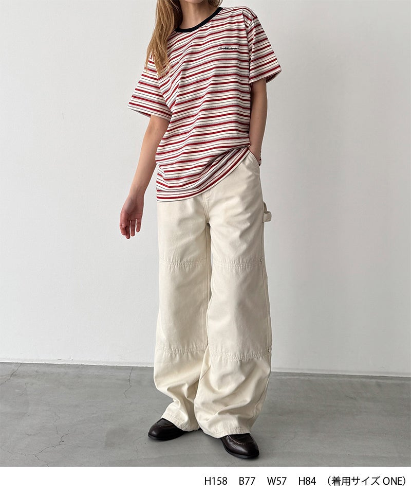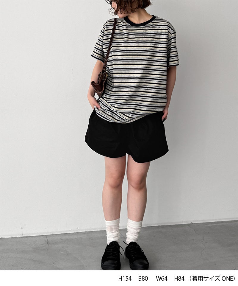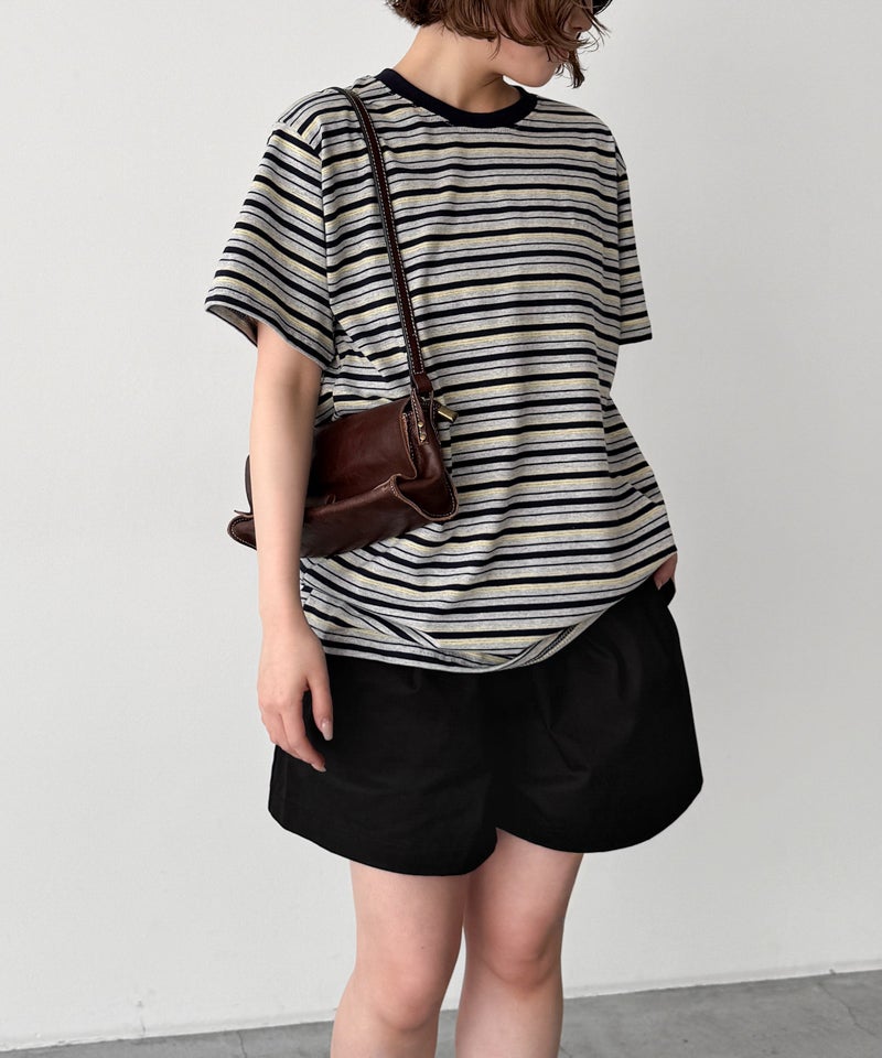 存在感のあるマルチボーダー柄なのでボトムスはシンプルにまとめるのが◎