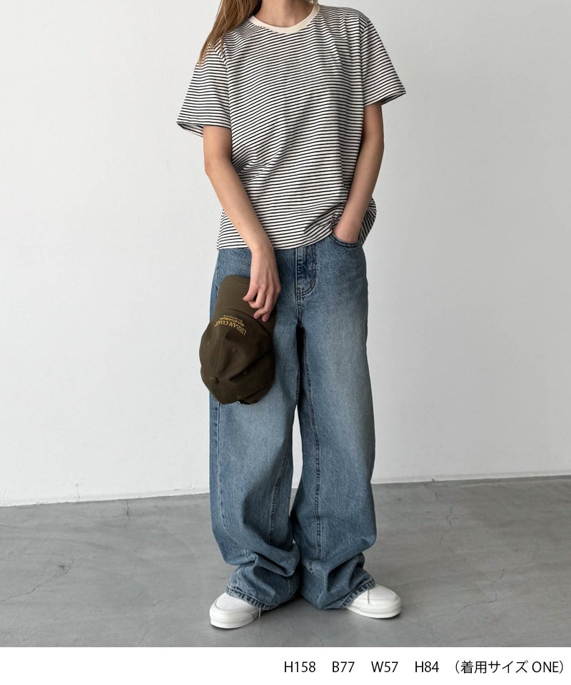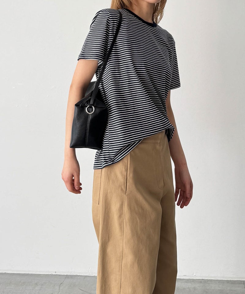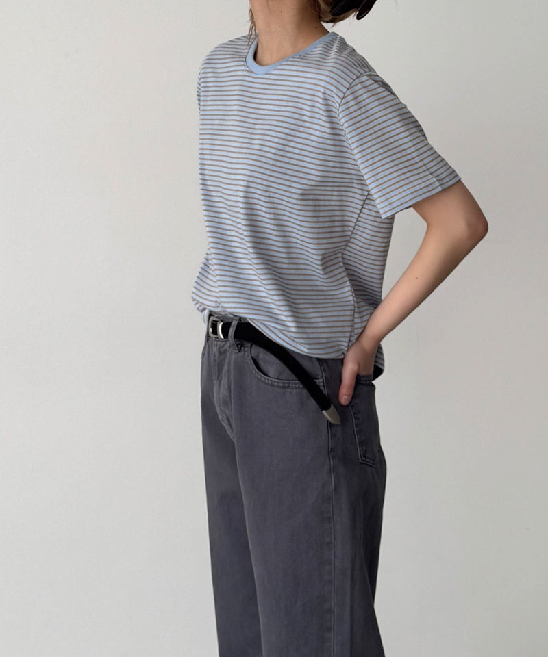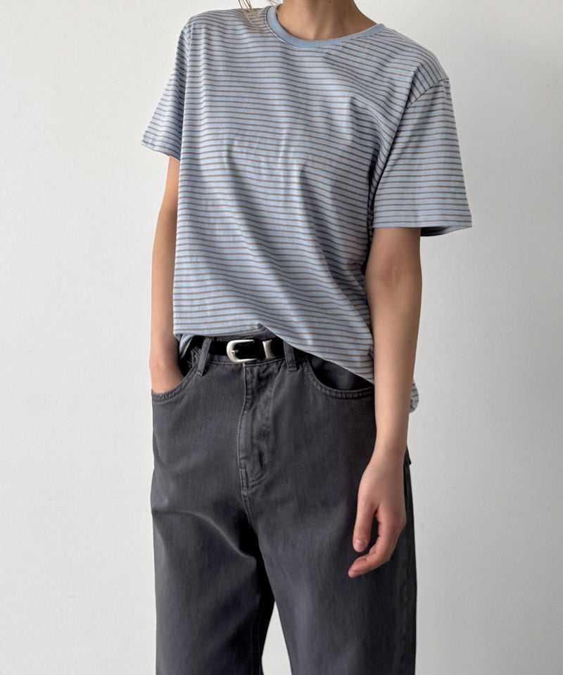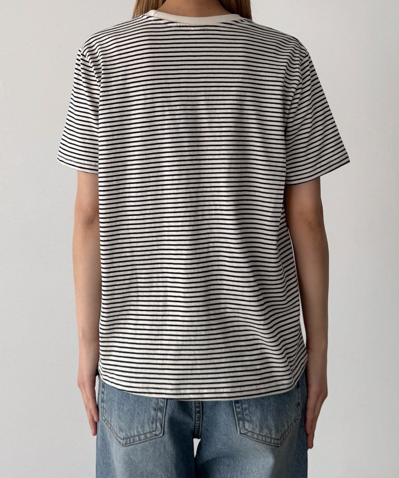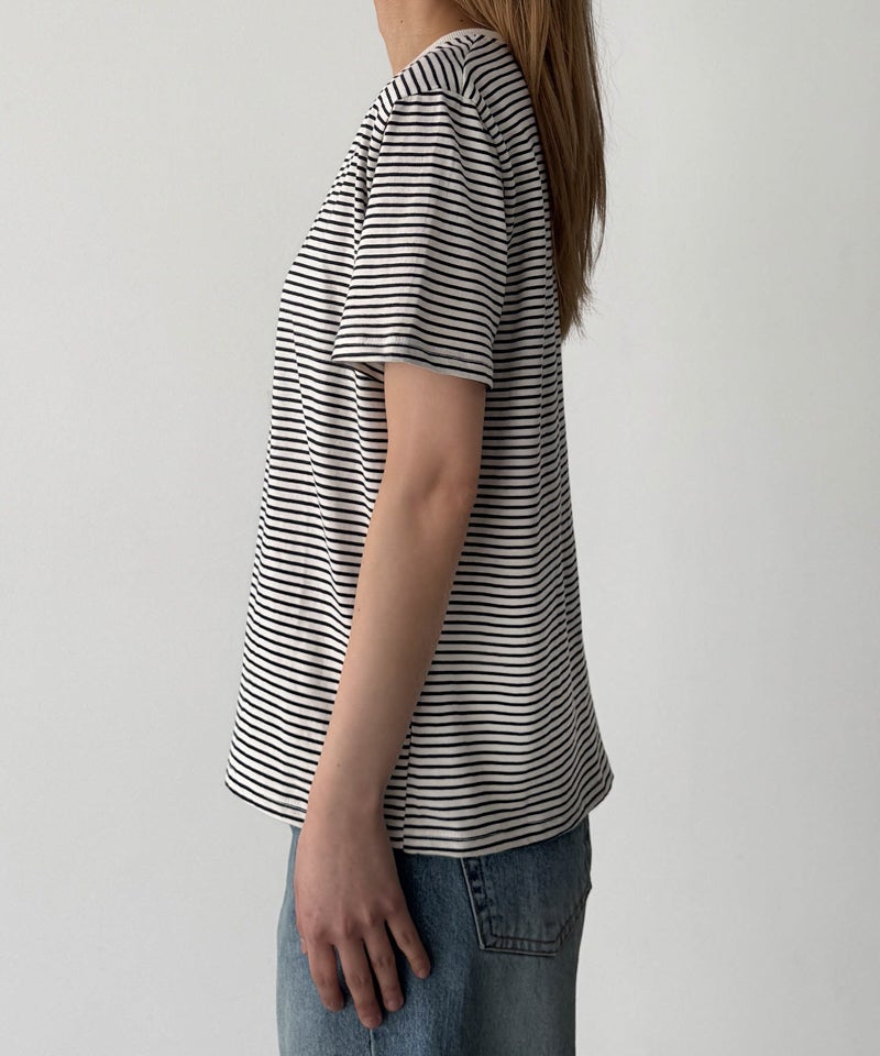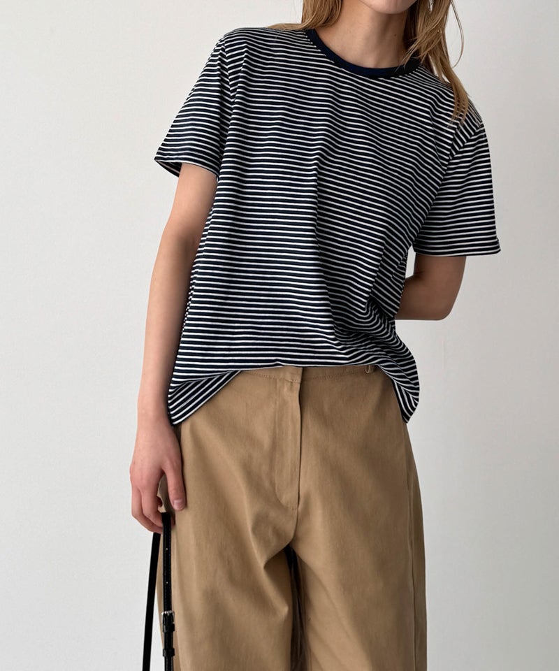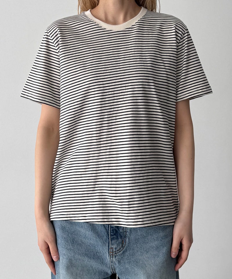細めのナローボーダー柄が爽やかな半袖Tシャツ。