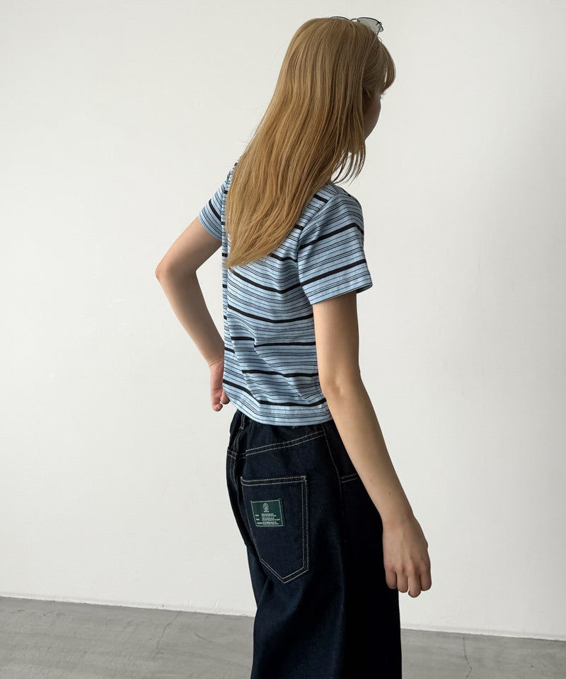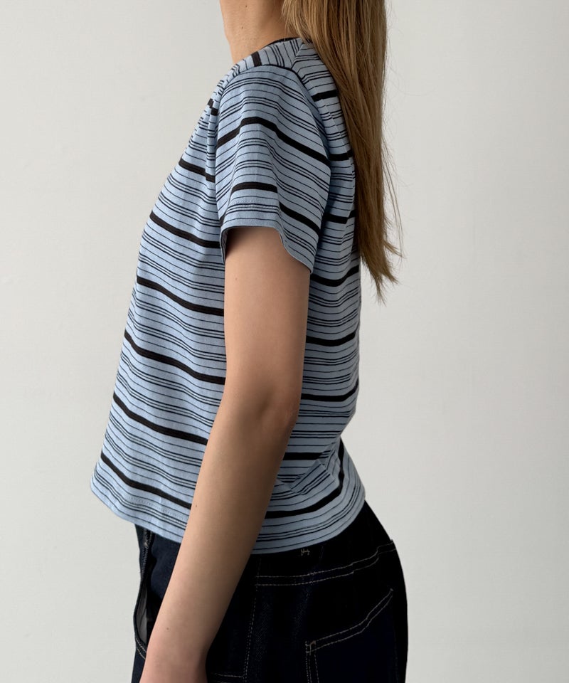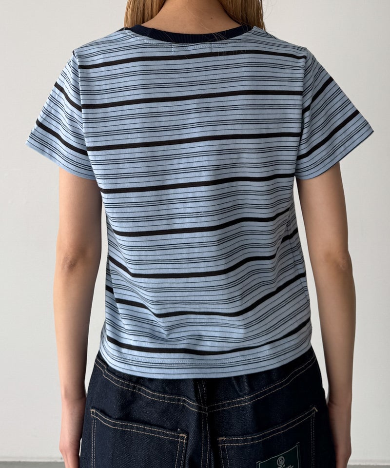 レトロなマルチボーダー柄が目を惹く、コンパクトTシャツ。
