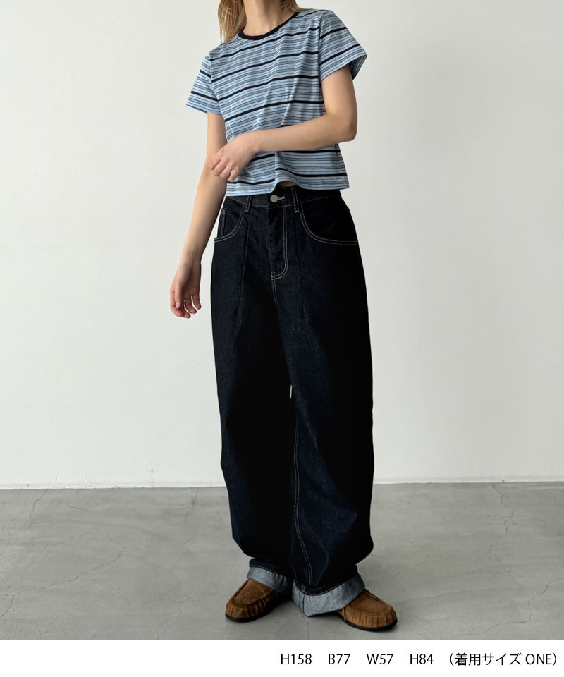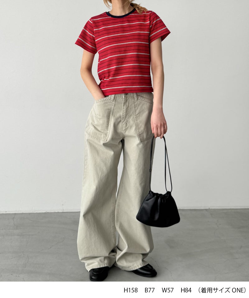 短めの着丈なので、ハイウエストのデニムやカーゴパンツと相性抜群。