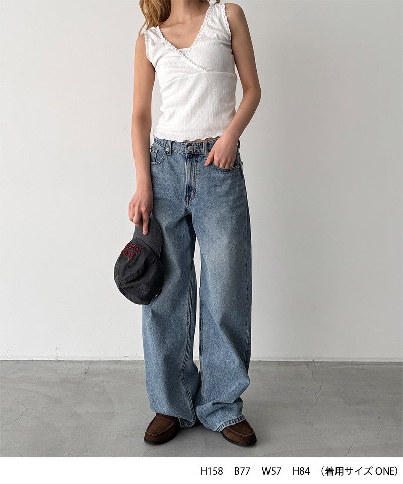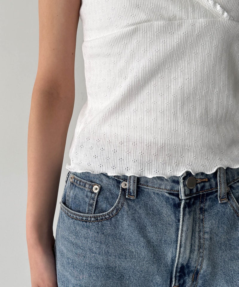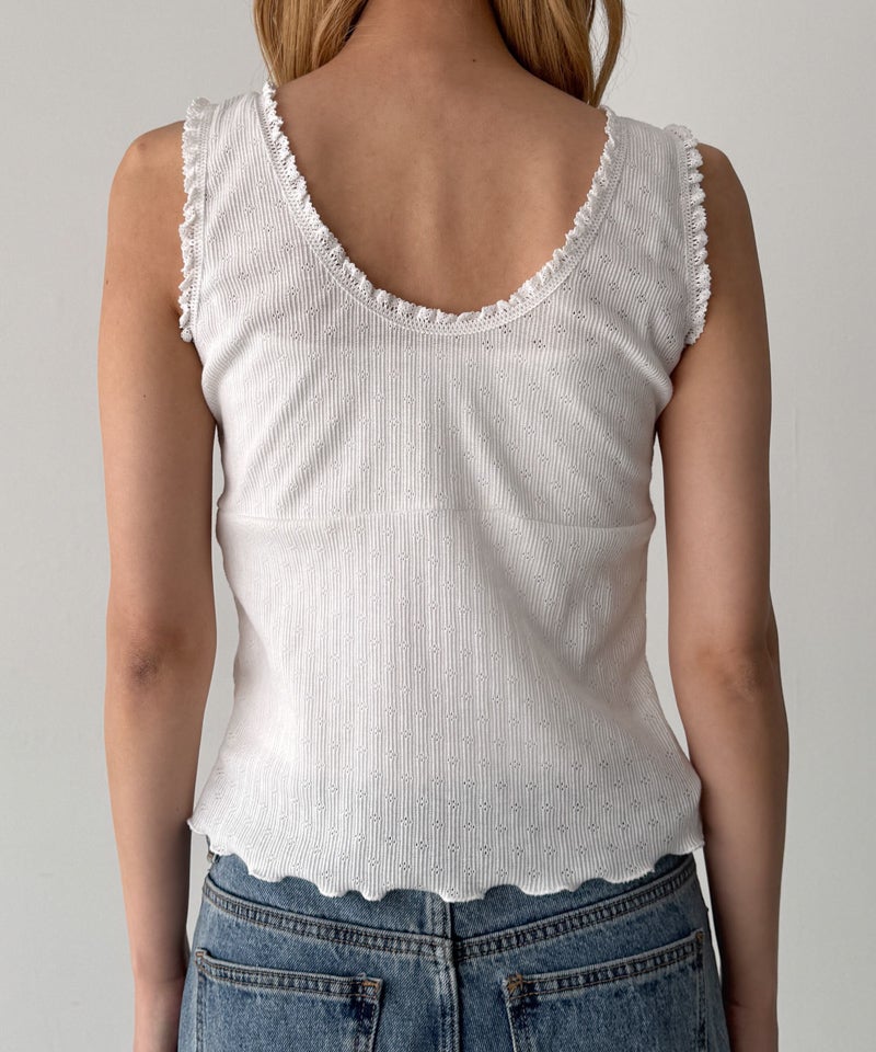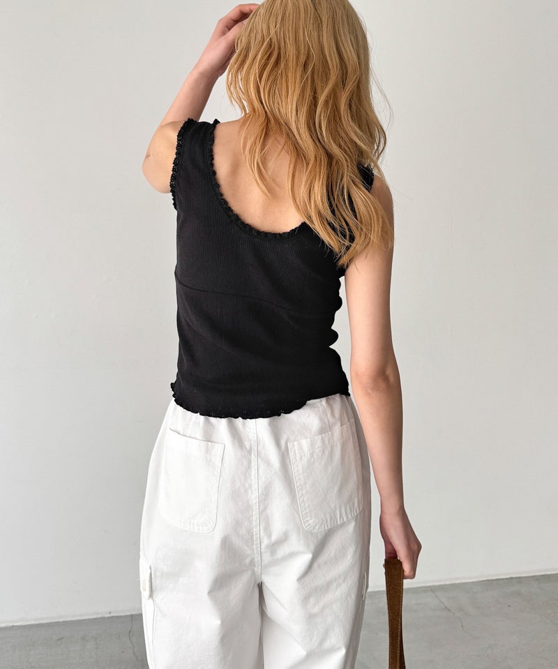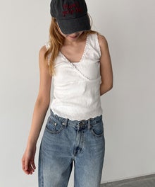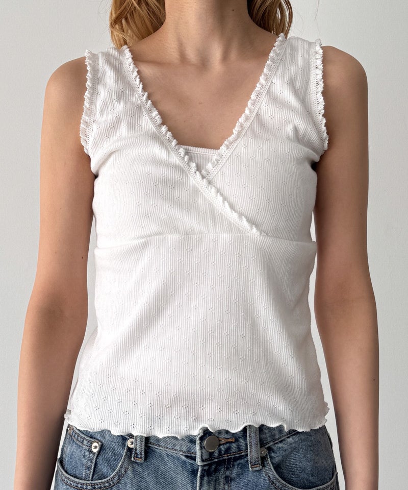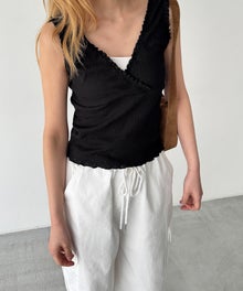 フロントのカシュクールデザインと、胸元に施された繊細なレーストリムがレトロで上品な印象を与えるタンクトップ。