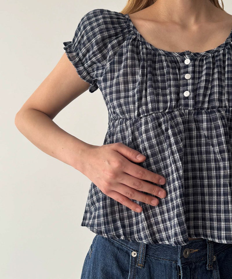 チェック半袖パフブラウス
