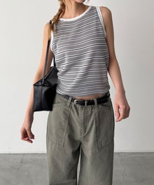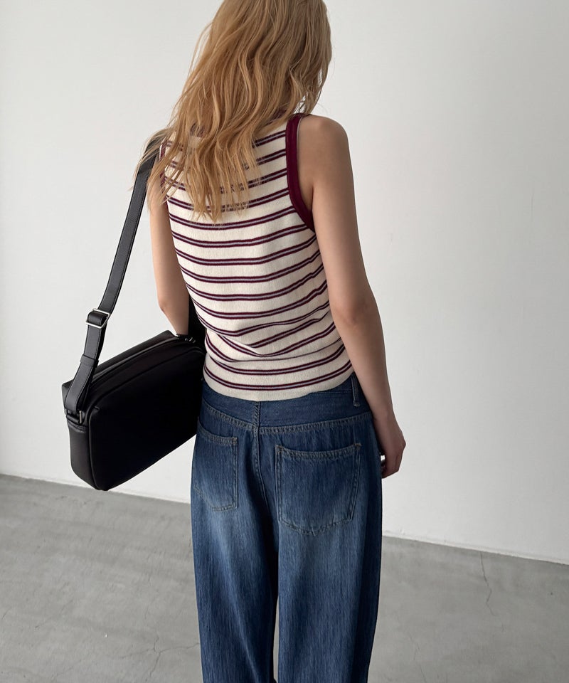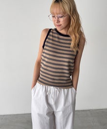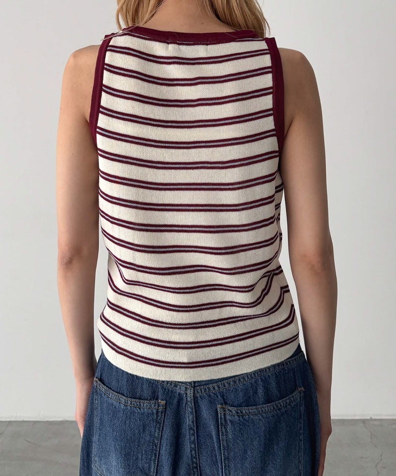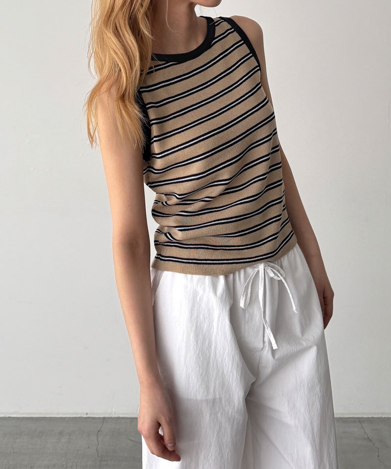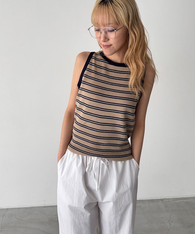 首元とアームホールを配色で切り替えたリンガーデザインがコーディネート全体を引き締め、ヘルシーな肌見せを叶えます。