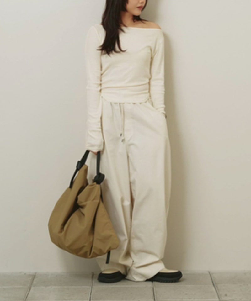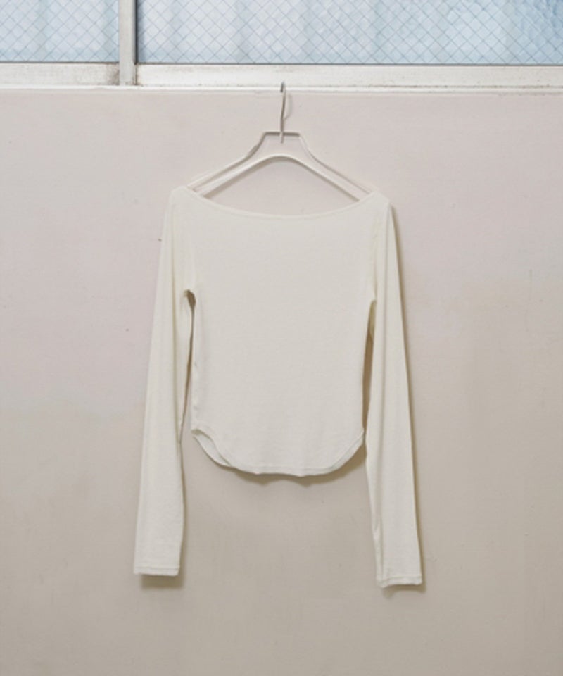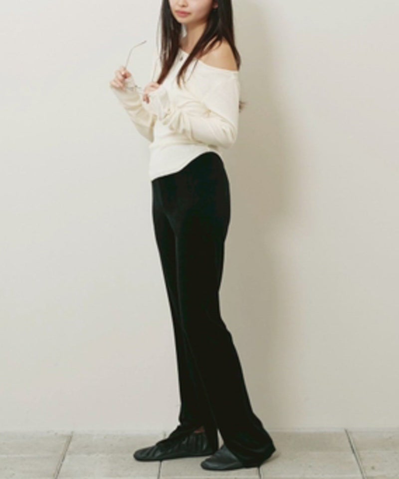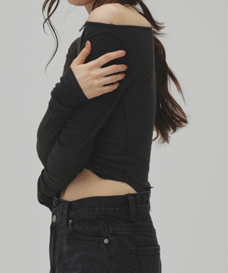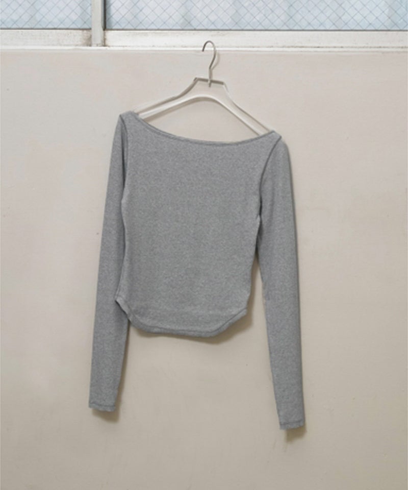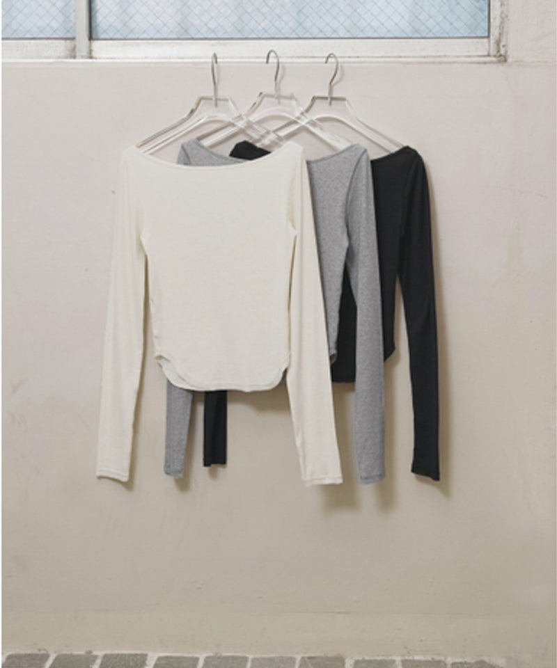 広めのネックラインはオフショルダーとして着用したり、ワンショルダー風にアレンジすることで女性らしい抜け感を演出。