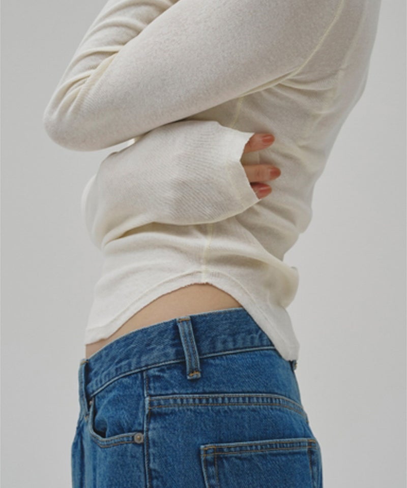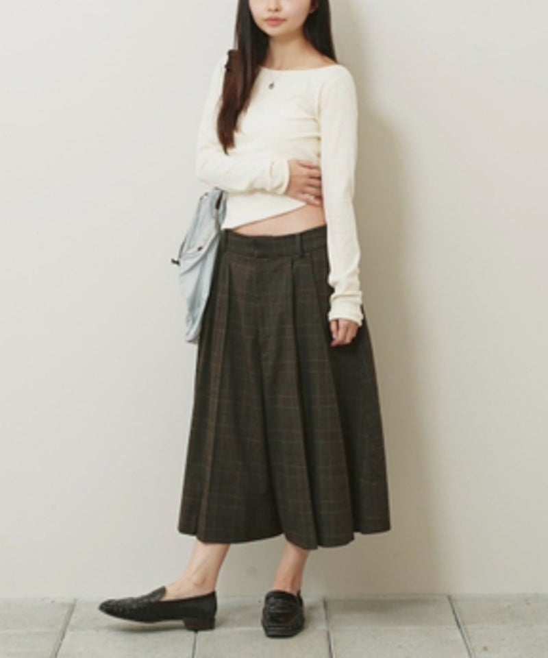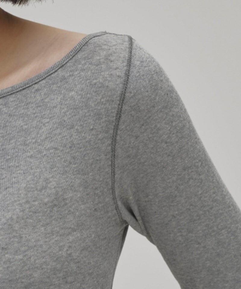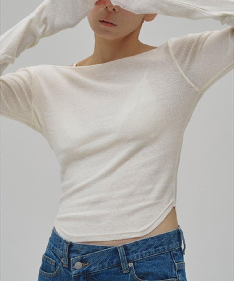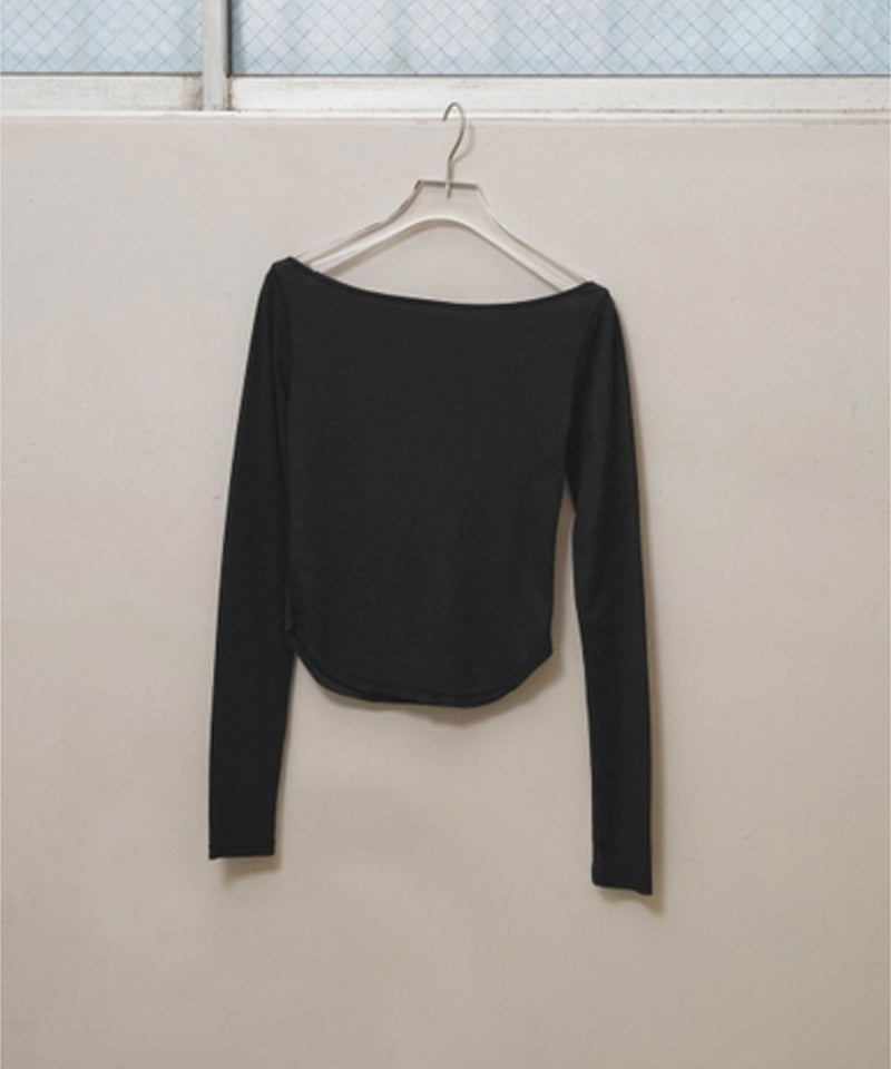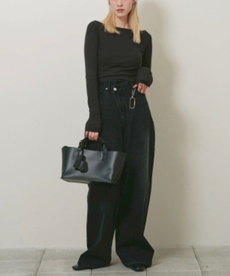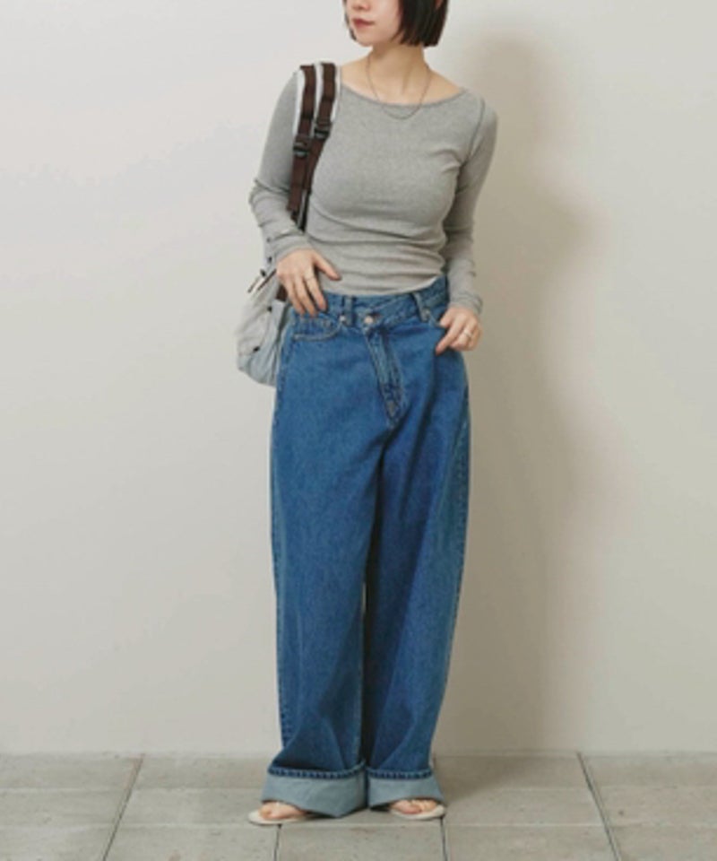 広めのネックラインはオフショルダーとして着用したり、ワンショルダー風にアレンジすることで女性らしい抜け感を演出。